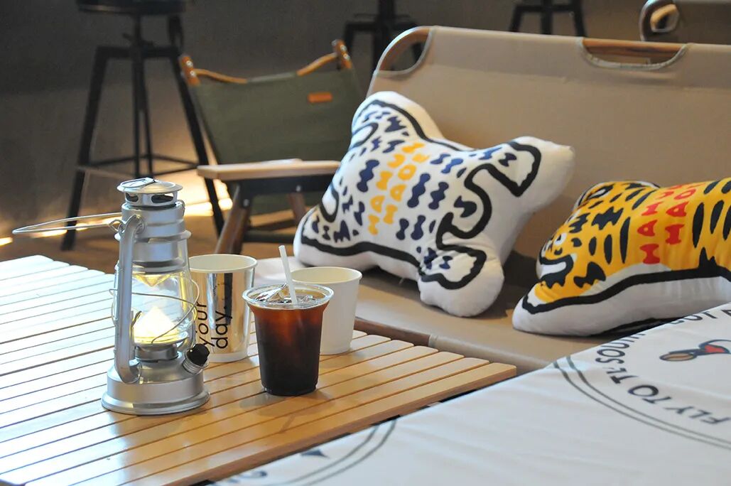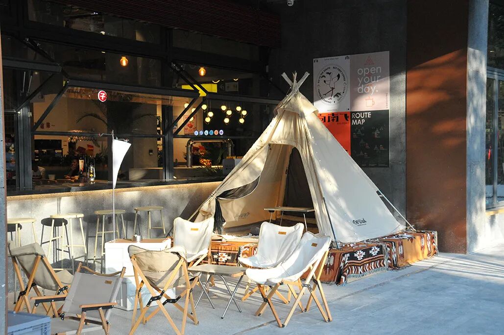 廿肆·春晓店提供多种空间,满足不同需要。大开窗的临街吧台,是秋日办公的绝佳景观位;野营主题的灰空间满足足不出南翔的露营需要;98寸大电视前铺排的长桌,满足20余人聚餐、活动等多元化需求。