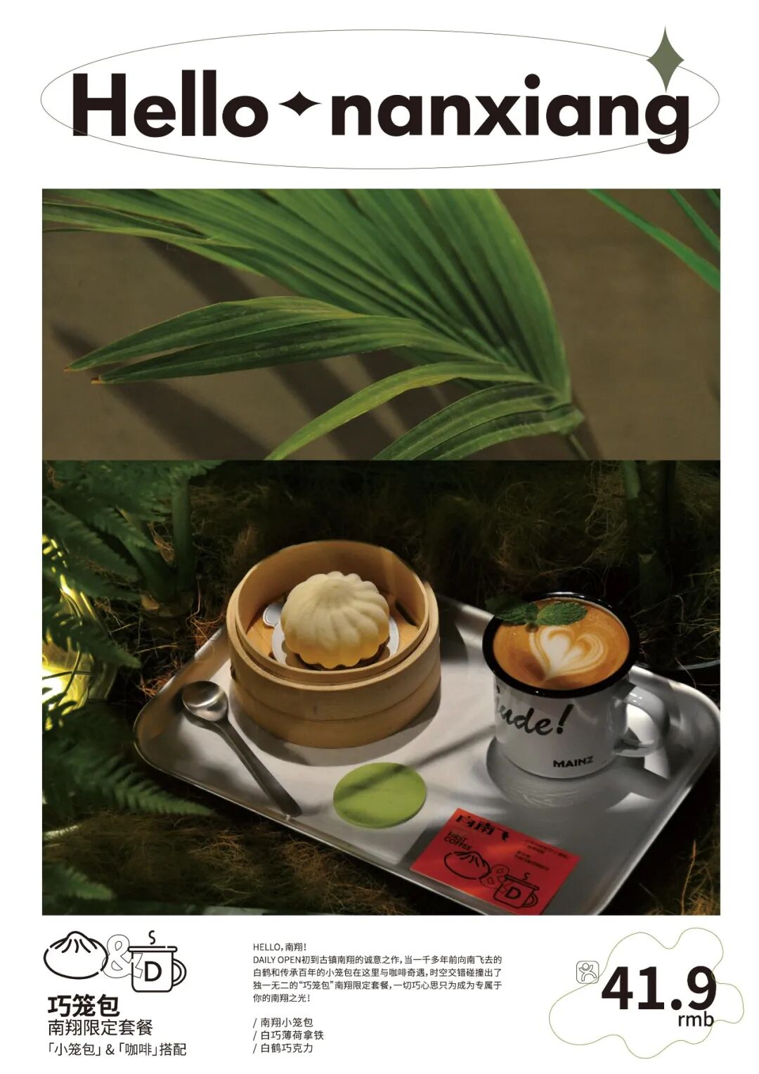 正值南翔小笼包问世150周年,Daily Open以小笼包为原型,定制南翔店专属甜品。酸甜慕斯、白鹤印花的巧克力,搭配季节限定的白巧薄荷拿铁,是南翔的专属味道。