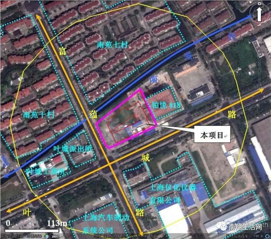 此项目位于上海市嘉定区叶城路866号,南侧紧邻叶城路,西侧紧邻富蕴路,北侧为南苑泾天然河道,东侧为已建高层办公楼。