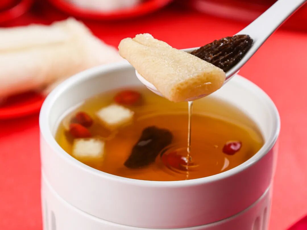 选用各种时蔬以及菌菇熬的素高汤,再加入羊肚菌,以及竹荪再次进行蒸制,整道汤品清甜素雅,香味浓郁,很合适夏天。