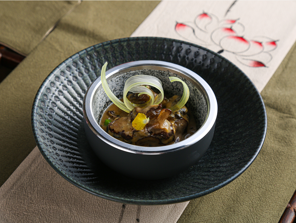 选用松露酱(黑松露被誉为餐桌上的黑钻石,具有18种氨基酸),芋头以及海参菇,芋头先蒸熟后烤干水分,因此口感会更丝滑,海参菇是经过加工煸香(海参菇口感像是海参,富含较高的蛋白质)再与松露酱,芋头相结合,搭配酱汁一同入口会更加鲜美。