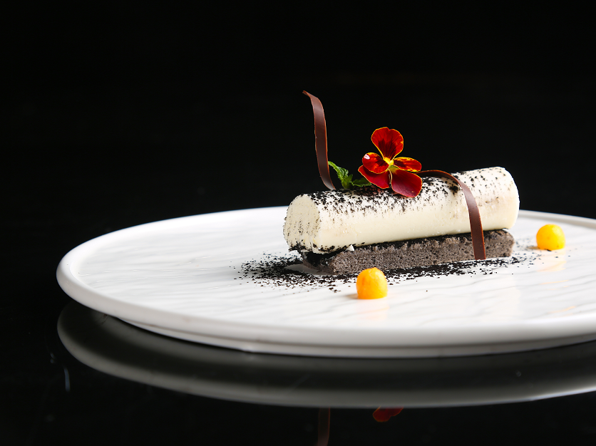 垫底是可可粉做的蛋糕胚,上面的是选用铁棍山药做的慕斯,蛋糕的苦配上慕斯的甜让整道甜品口感更加绵密。