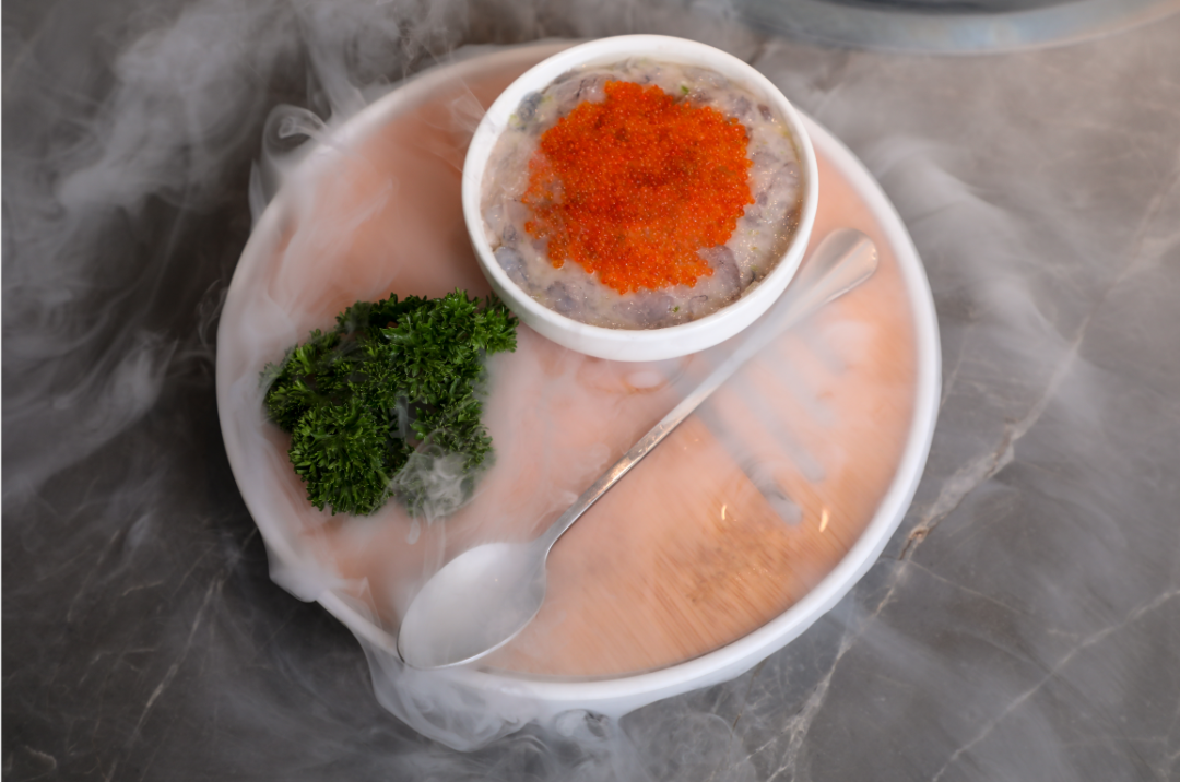 新鲜虾滑加入颗粒分明的飞鱼籽,口感丰富,每一口咬上去,鱼子在唇齿间爆裂,虾肉鲜香滑嫩。