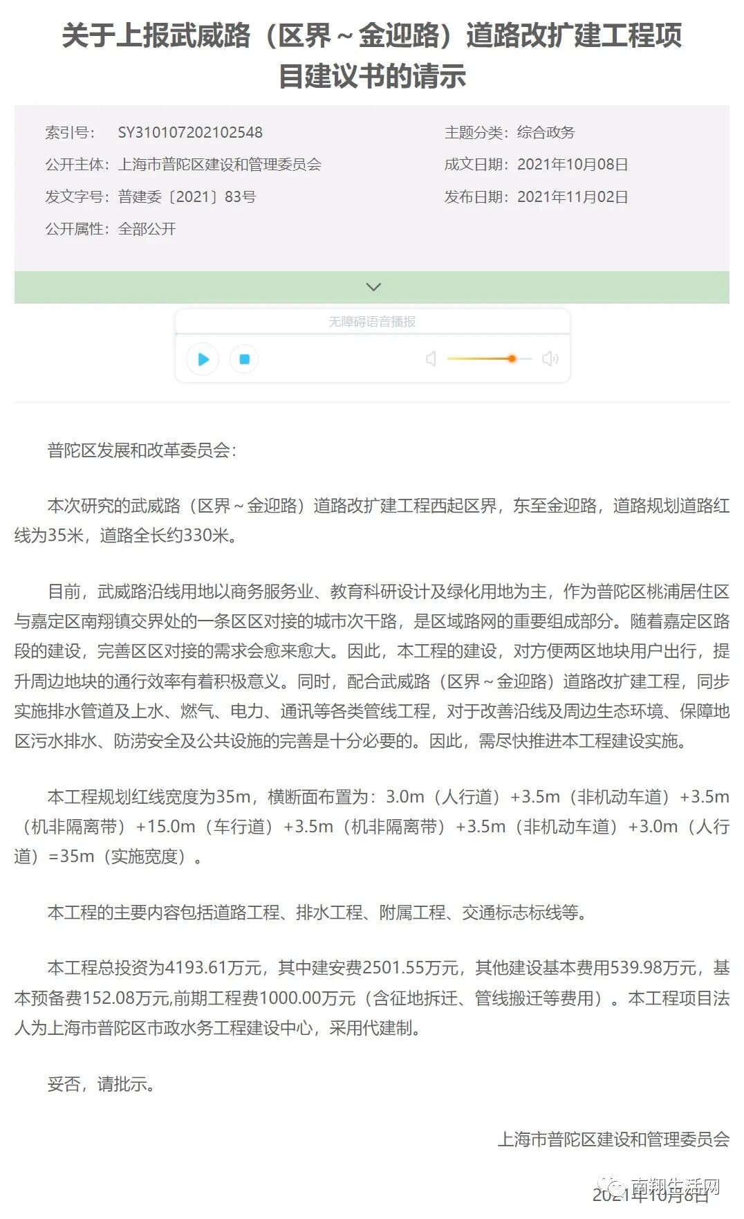 近日,普陀区建管委向区发改委提交了《关于上报武威路(区界~金迎路)道路改扩建工程项目建议书的请示》。