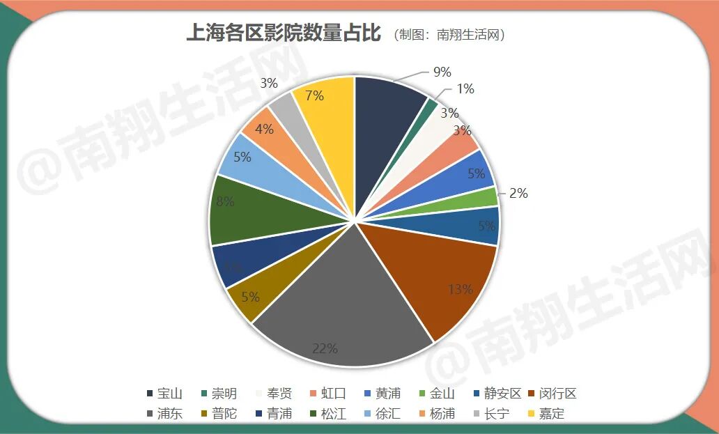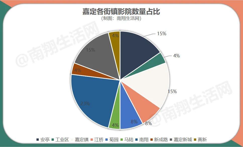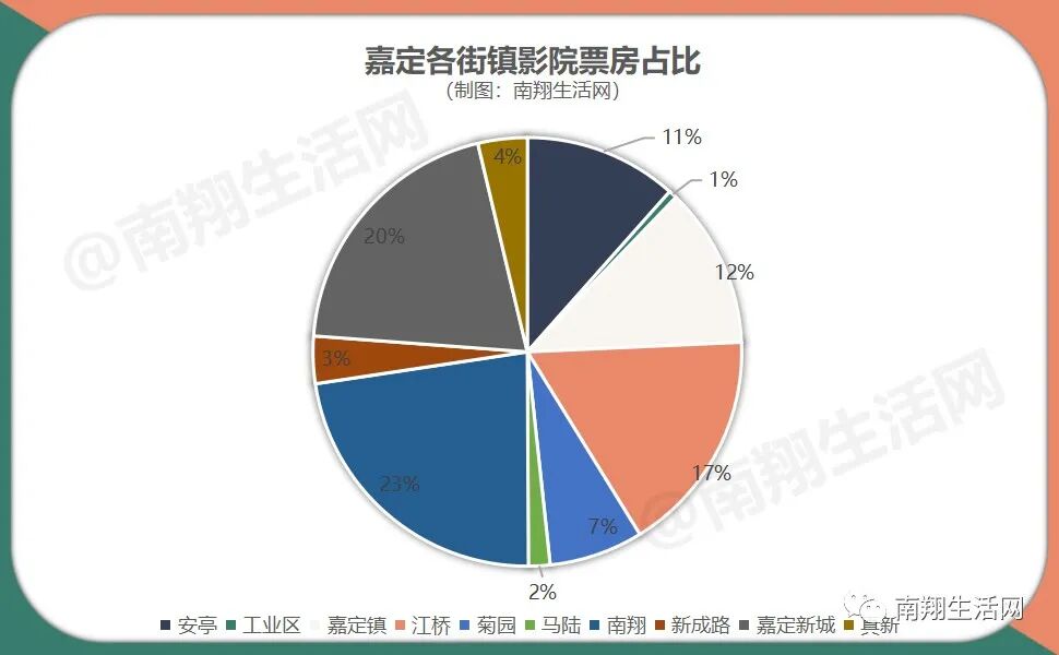 除了影院的票房悬殊外,影院分布也非常不均衡,全区26家影院,密度最大的在南翔,33平方公里的嘉定最小面积的镇,拥有6家电影院,数量占比高达23%。其次是嘉定新城+马陆的5家及嘉定镇街道的4家。