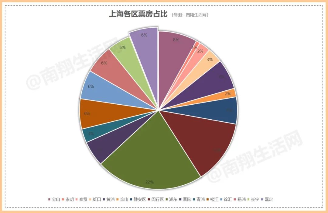 而票房的贡献度方面,嘉定约1.3亿的票房占比为6%,排名全市第11位。