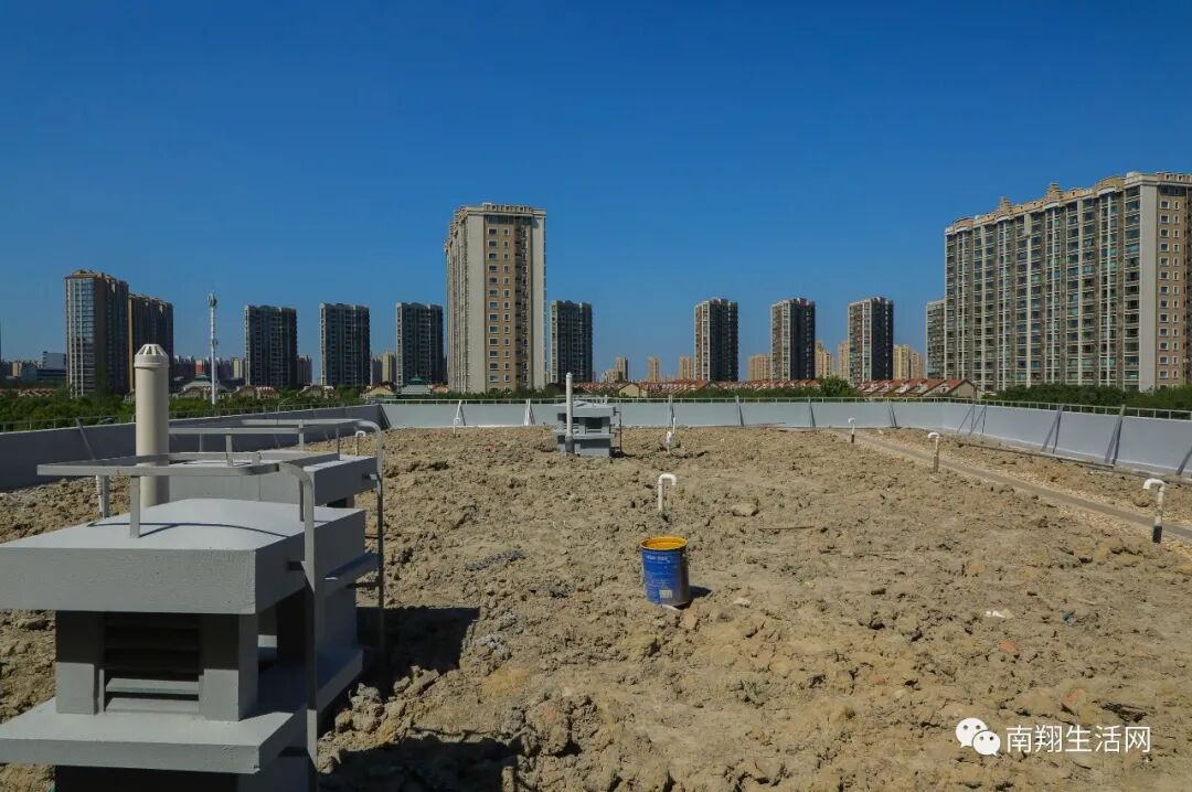 来到屋顶,这里不是尖顶而是全平,上面铺满了真土,据现场师傅说,这里将铺上草皮,打造一座屋顶花园!