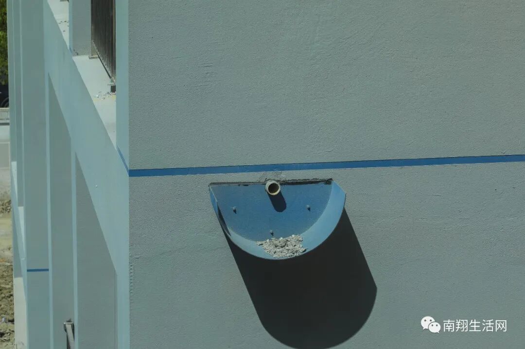 另外还有一点小编注意到,幼儿园设计师似乎很注重细节,在雨水管接头处特别加装了一个导流槽,这样溢出的水流就不至于以后侵蚀墙面,留下水印。