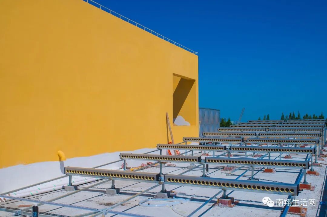 这所幼儿园设计师是动了脑筋的,虽然小编对建筑审美并非特别擅长,但肉眼可见这个建筑充分考虑了与周边生态的关系,通过视线、通风等多角度强化自然环境与孩子活动之间的链接,而俯瞰公园、内享庭院、顶游花园…让孩子们有了多维的生态体验。这真不是所有幼儿园可以做到的。   追求绿色环保的工业风 在楼上一侧,小编注意到大量的太阳能管道。据了解,幼儿园不仅仅只有太阳能,而且还会采用空气源热泵,满足幼儿园全部热水需求!