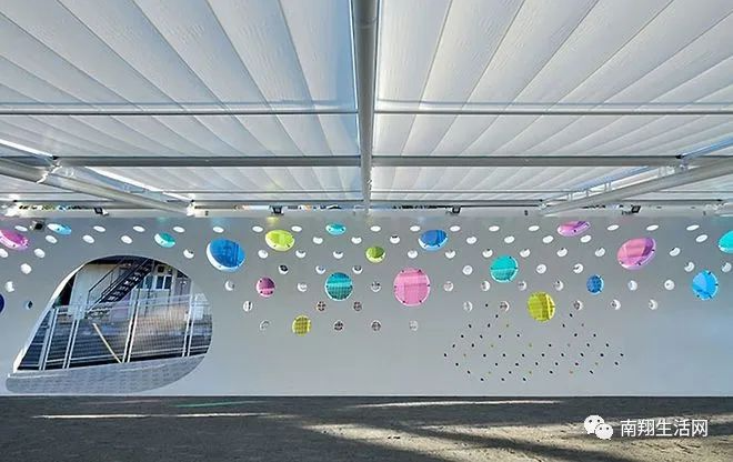 小编记得西班牙格拉纳达的教育中心和东京Machida Kobato幼儿园的就是这种处理方式。   西班牙格拉纳达的教育中心   在阳光明媚的时候,光线透过彩色的玻璃窗在建筑里形成一个彩虹过道,相当梦幻。