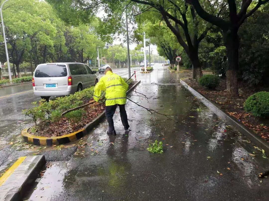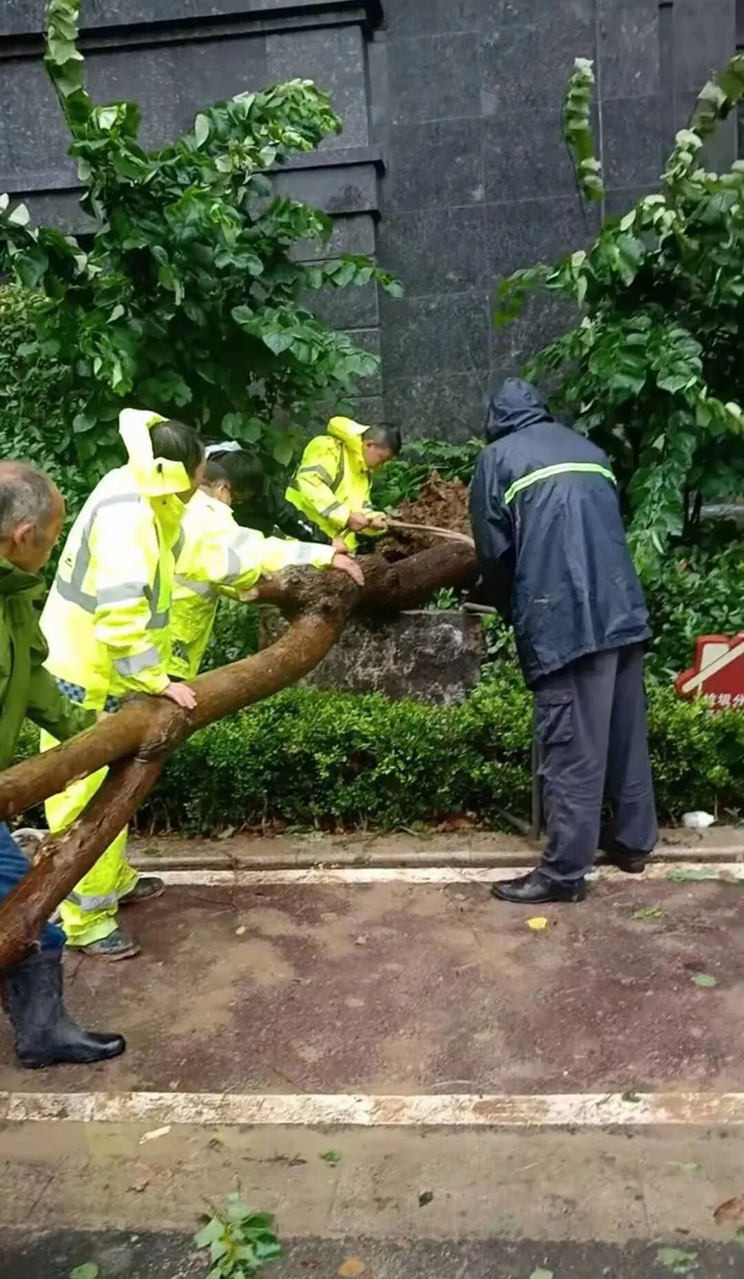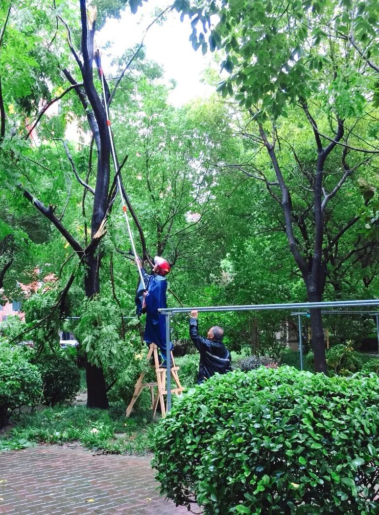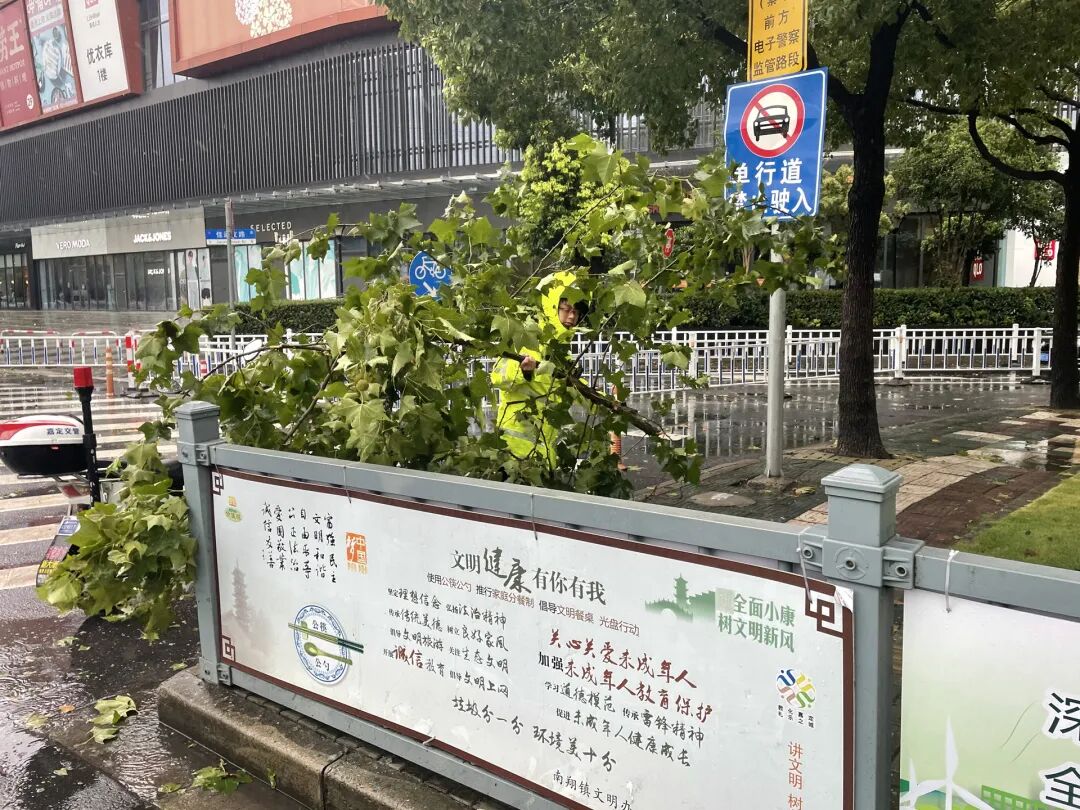 在南翔社区的各个小区内,工作人员正在清理被台风刮倒的树枝,防止伤到行人。