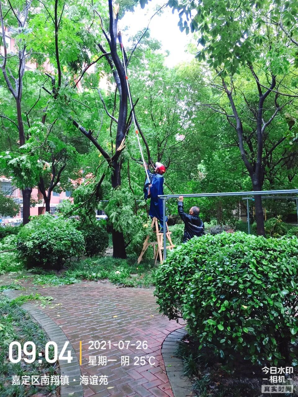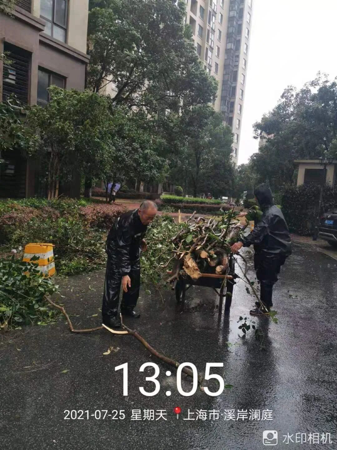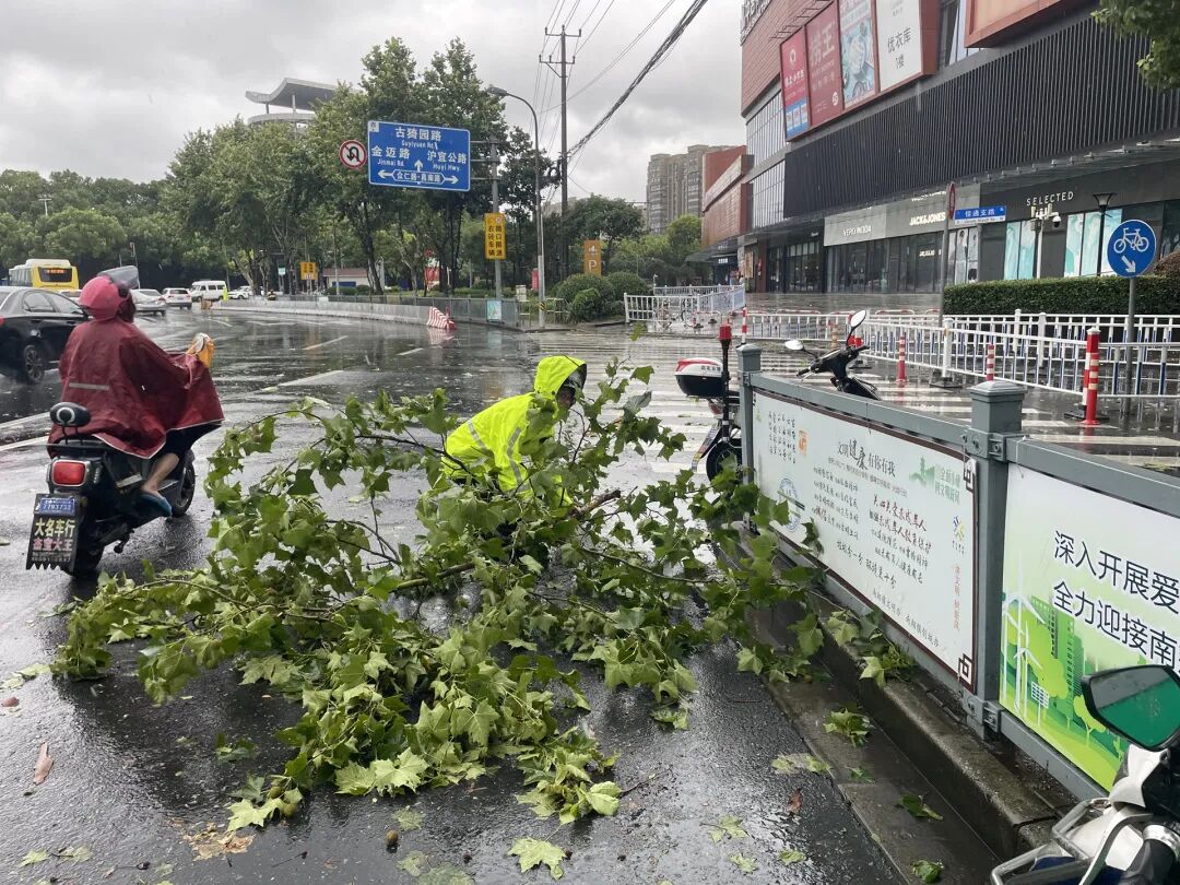 在南翔社区的各个小区内,工作人员正在清理被台风刮倒的树枝,防止伤到行人。