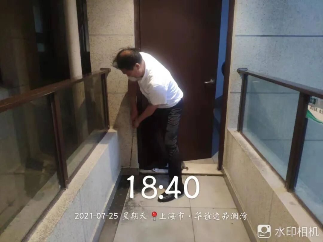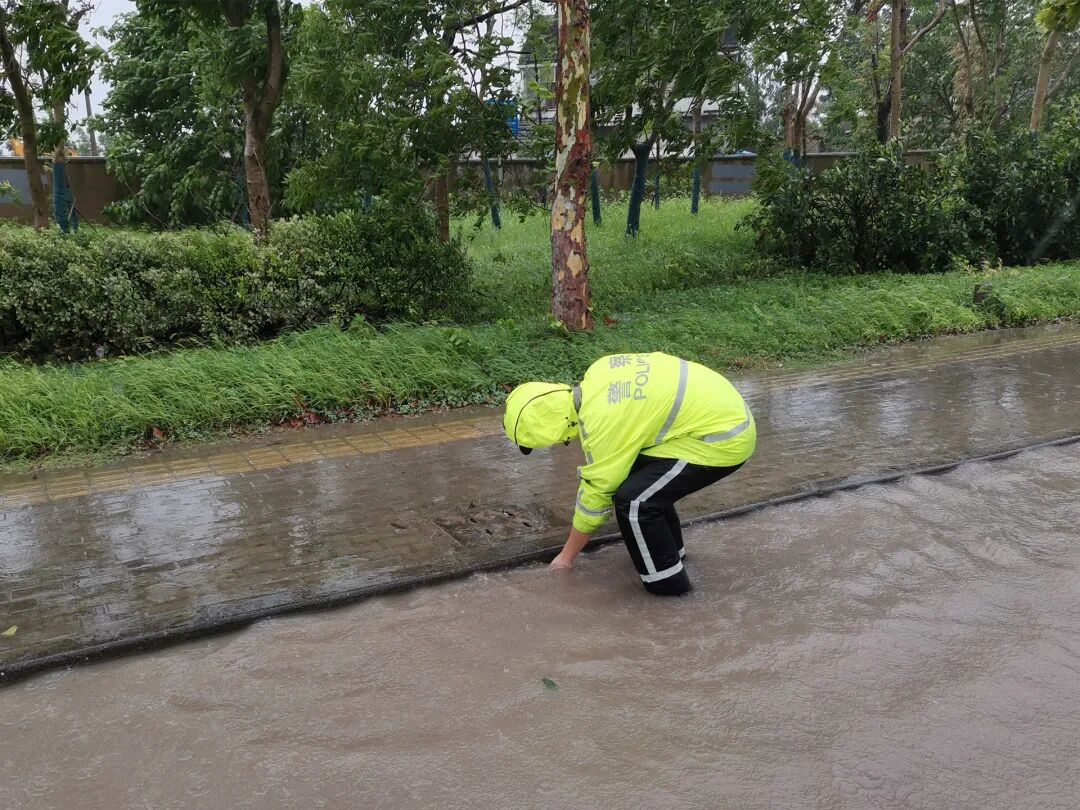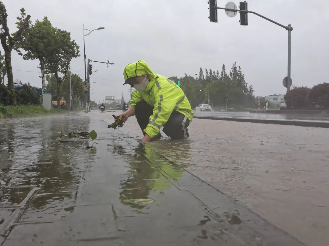 封浜所民警张世杰在翔江公路解放岛东环路发现下水道堵塞导致路面积水,徒手清理树叶等物,缓解路面积水情况。