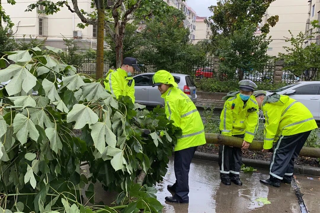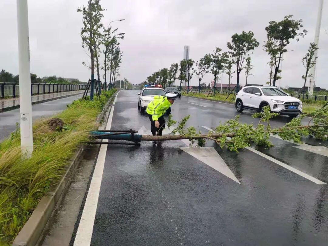 新成所民警在巡逻过程中发现路边树木被台风吹倒,迅速联系周边执勤辅警及相关部门,合力将断树移至不影响交通位置,并清理路面恢复道路通畅。