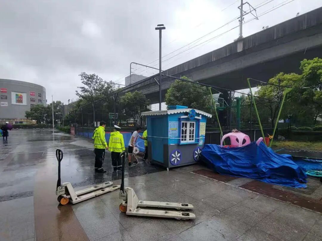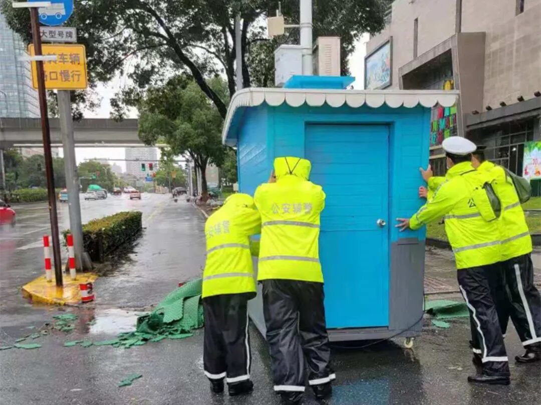 安亭所辅警发现辖区三德广场售票木屋被大风吹至道路中间,迅速将其归回原位。并协助工作人员予以固定。