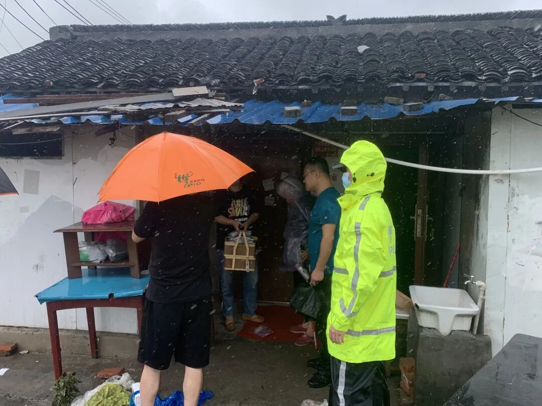 江桥所学警会同村委干部前往辖区幸福村,接独居老人到宾馆躲避台风。