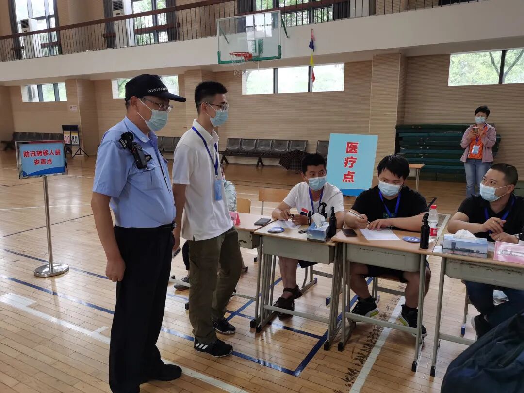 安亭所民警在安亭震川中学防汛抗台转移安置点配合属地政府开展人员安置,指导现场防疫措施。