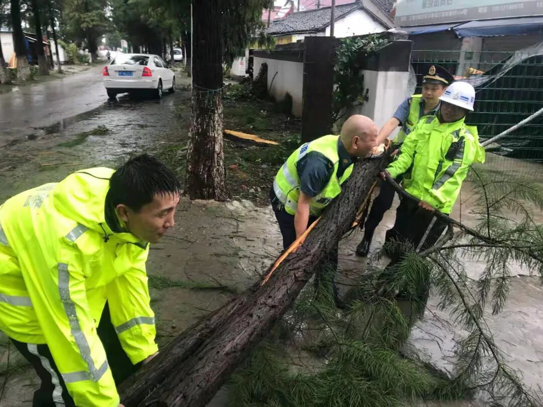 徐行所辅警在辖区巡逻中遇到路面被倒伏的树木阻断,会同派出所支援力量一同移除障碍,确保道路畅通。