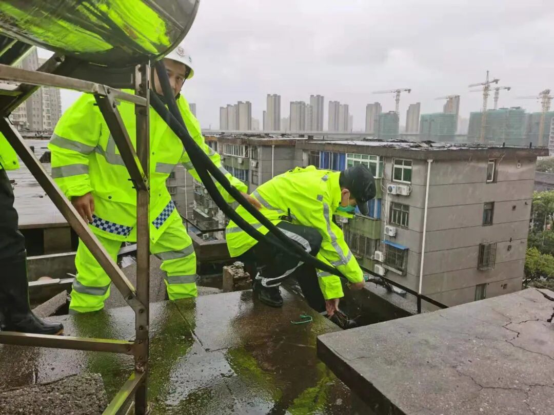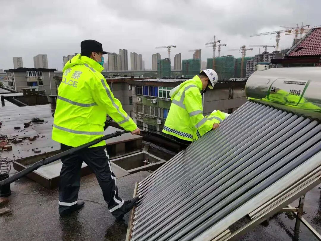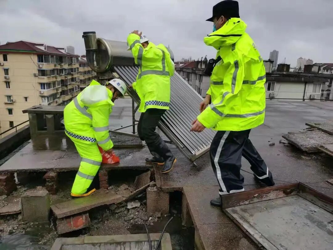 嘉城派出所民警带领社区工作人员在清河路453弄14号楼顶,将一台被台风吹坏的太阳能热水器拆除、分解后搬下楼,避免引发更大的事故。