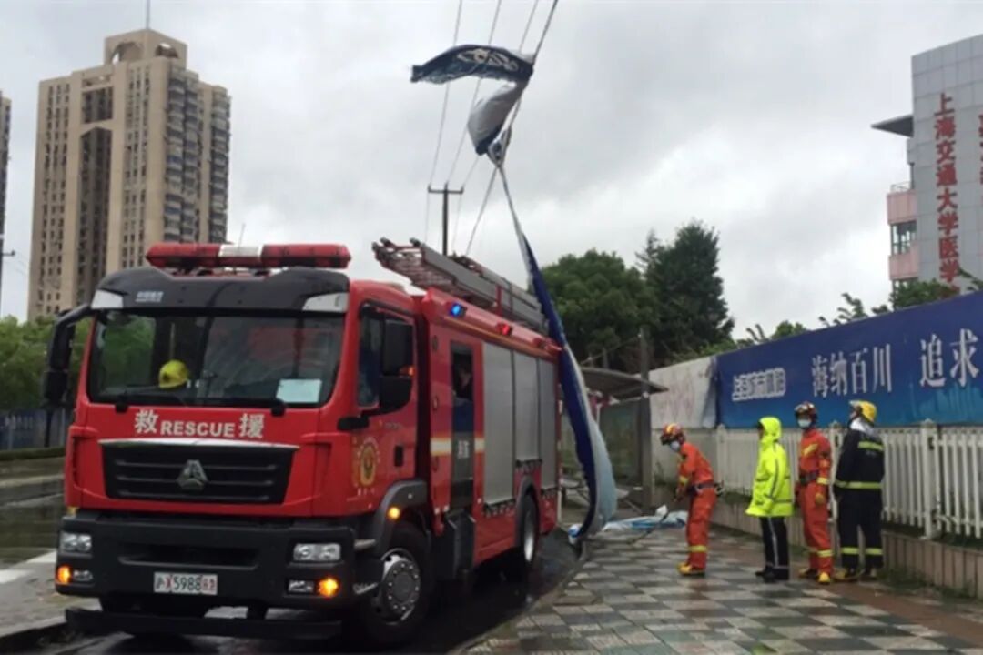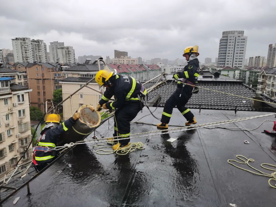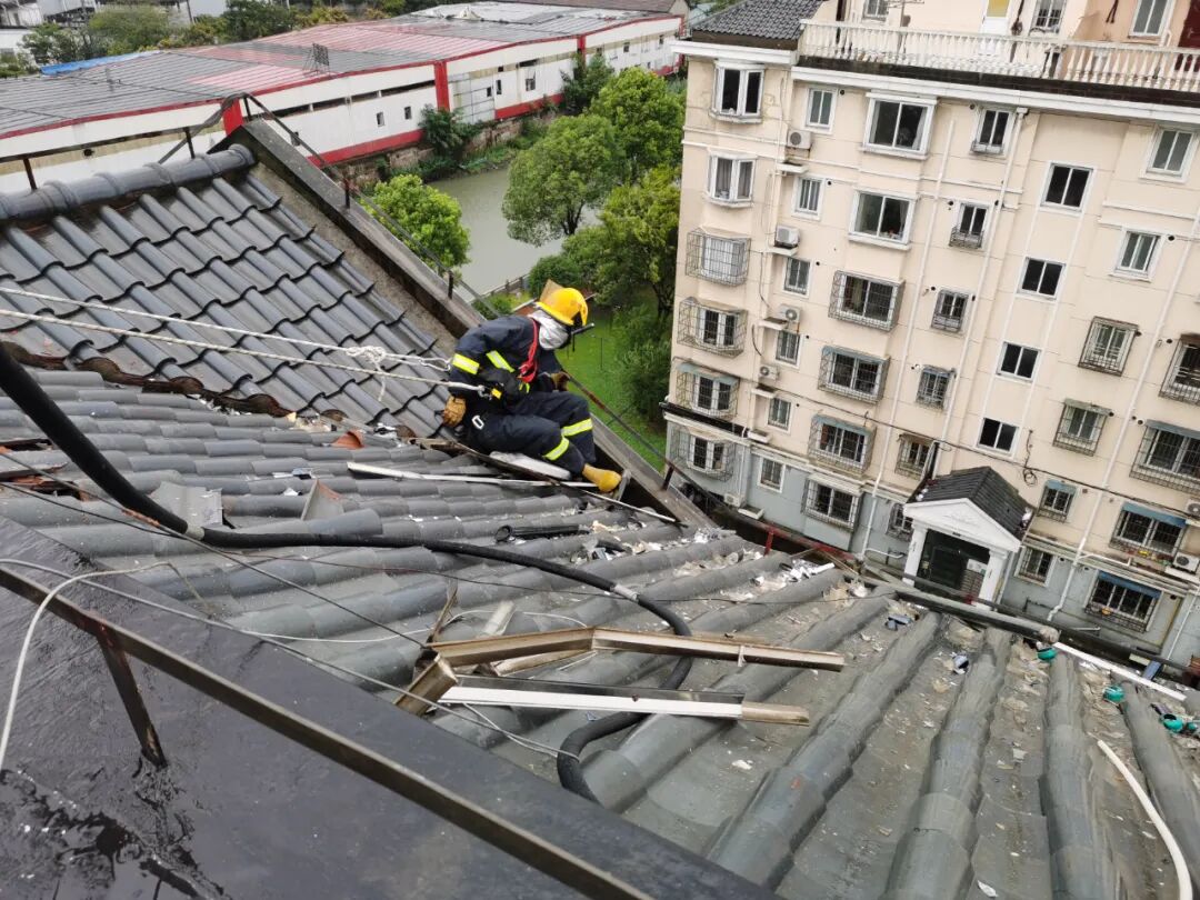 7月25日12时30分,安亭站辖区内某小区顶楼太阳能设施被大风刮至屋檐,安亭站到场后进行排险。