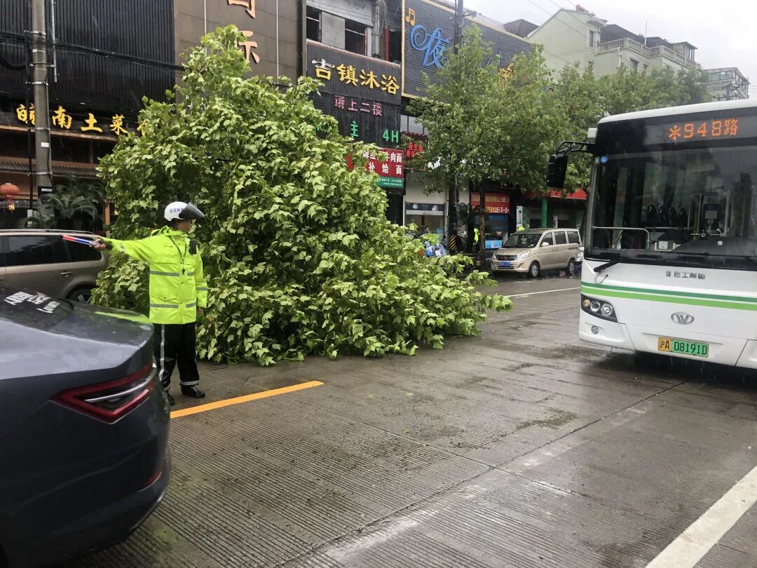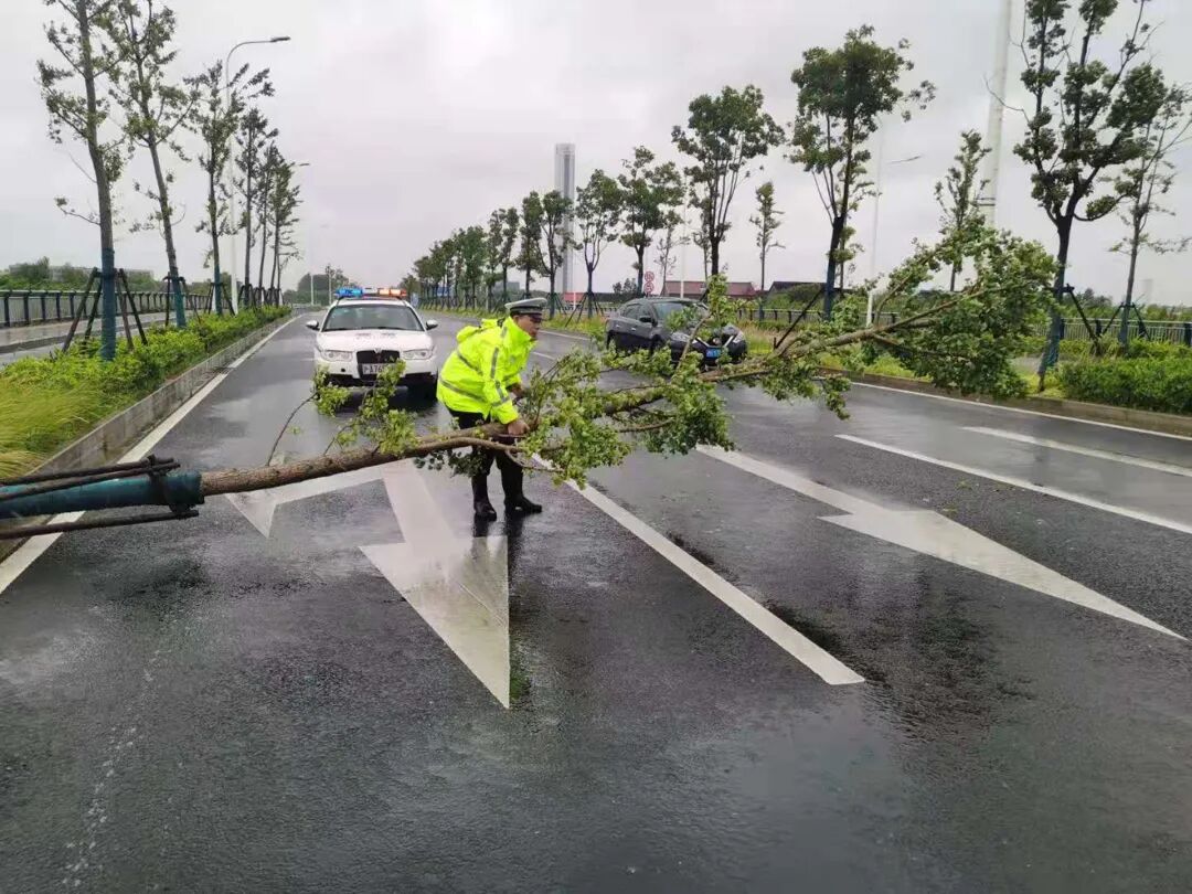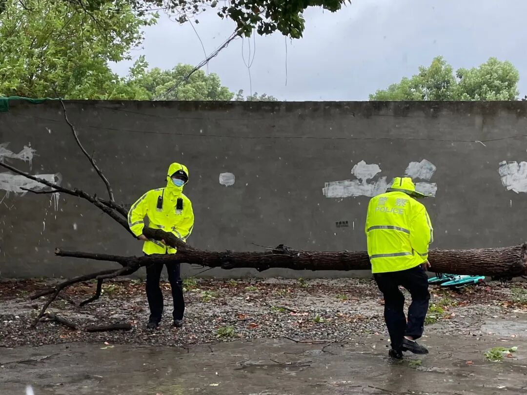 真新所辅警朱遥在执勤中发现梅川路万镇路一棵树被台风刮倒,横在道路上影响交通安全,和附近巡逻民警周洋一同指挥疏导交通,等待绿化清运部门前来处理。