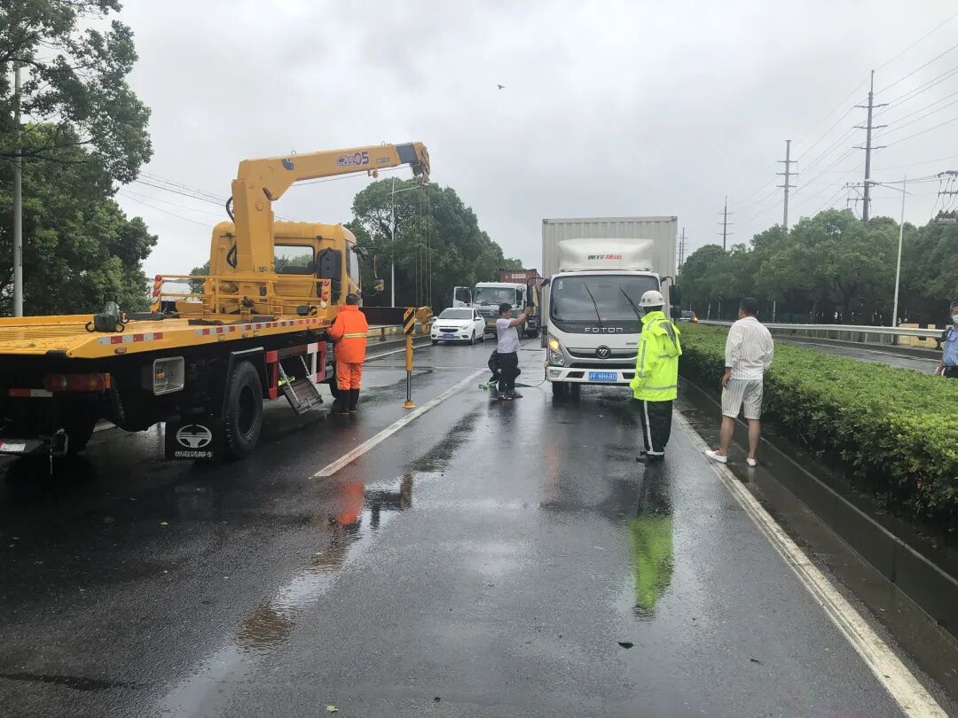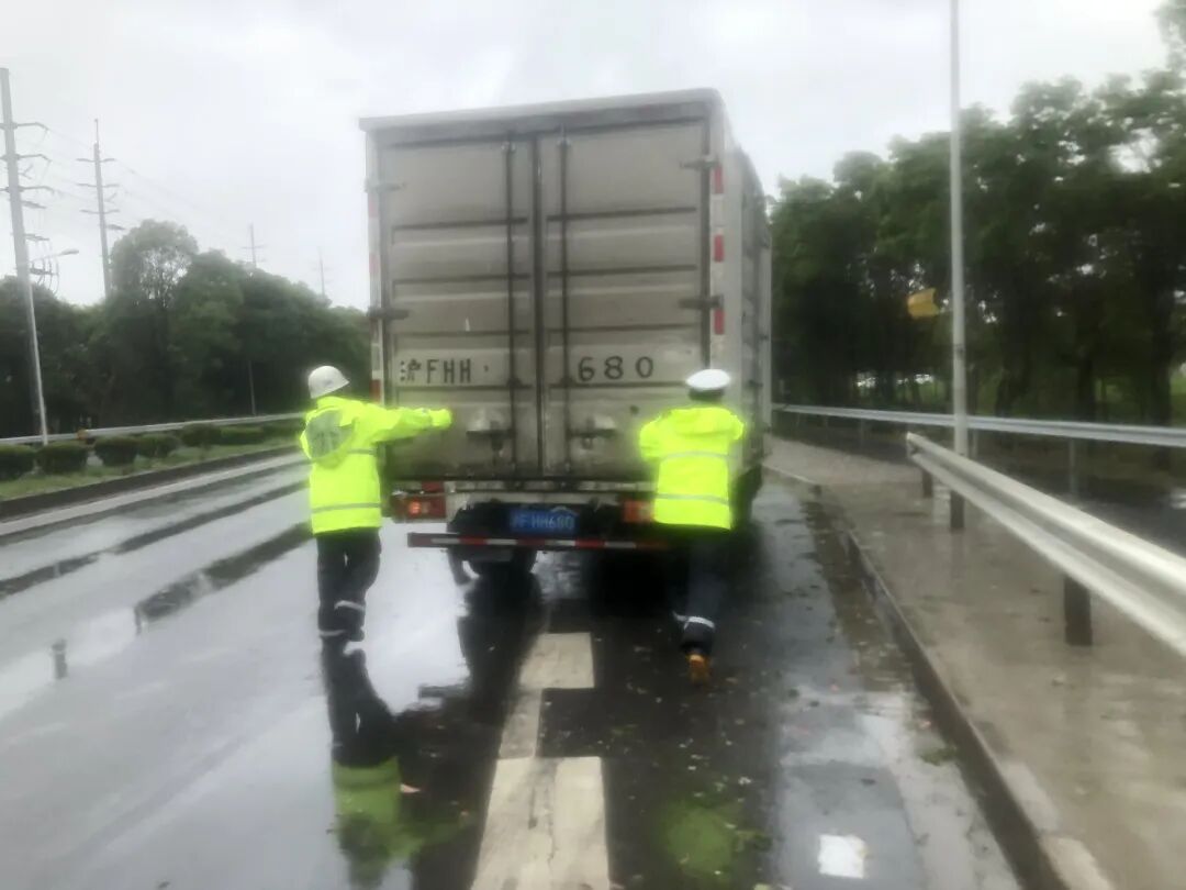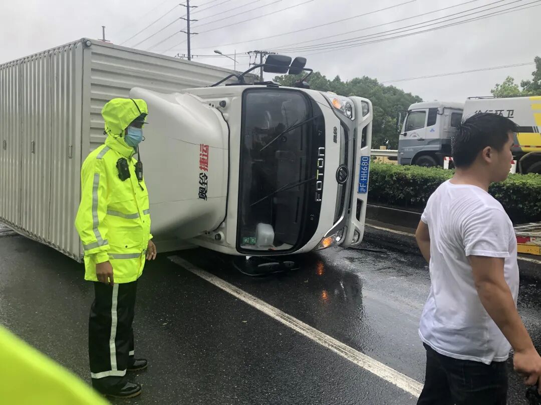 宝钱公路上一辆货车由于雨天路滑发生侧翻,横在道路上影响整条车道通行,娄塘所民警带领辅警及时到场处理,配合施救车辆实施救援,最终将侧滑车辆推至路边,并指挥交通,迅速恢复道路通畅。