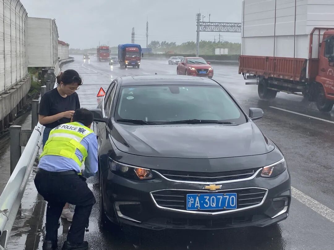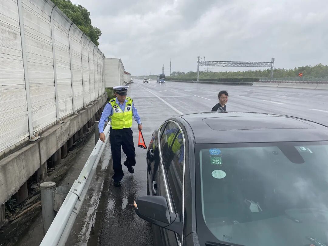 交警支队民警徐汝洪带领辅警在G2高速巡逻时发现车辆轮胎漏气抛锚警情,在了解情况后,快速帮助其临时补气,并指导驾驶员尽快驶离高速寻找修理店,避免发生危险。