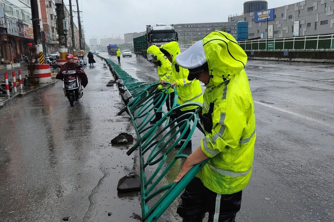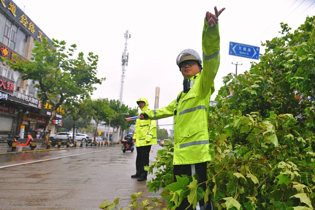 方泰所民警带领辅警在巡逻过程中遇到树木被吹倒,与辅警一同搬运折断的树木,疏导交通。