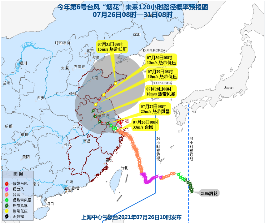 图例:灰色部分表示台风中心未来可能经过的区域,并不表示台风大小及影响范围,灾害性天气也可能出现在在阴影区之外。