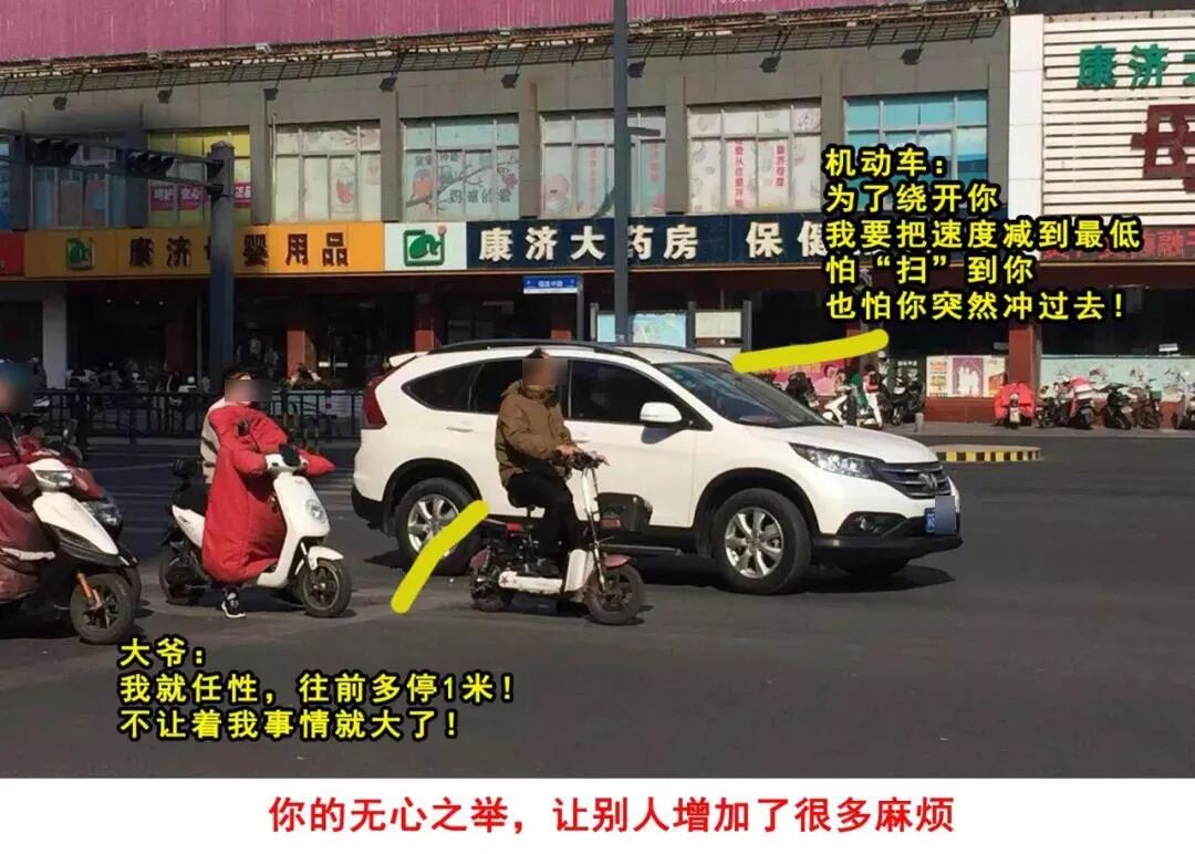 作为非机动车,灵活轻便是优势,一个绿灯的时间在路口等待的非机动车都能通过,所以,不要争相往前挤,这样一点都不酷!