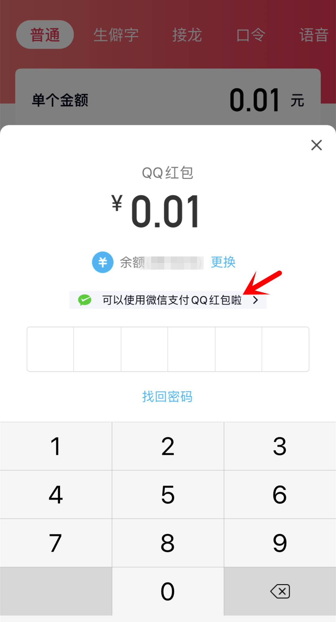 在往QQ红包塞钱时,页面会提醒“可以用微信支付QQ红包啦”,点击之后就可以跳转到微信支付页面。