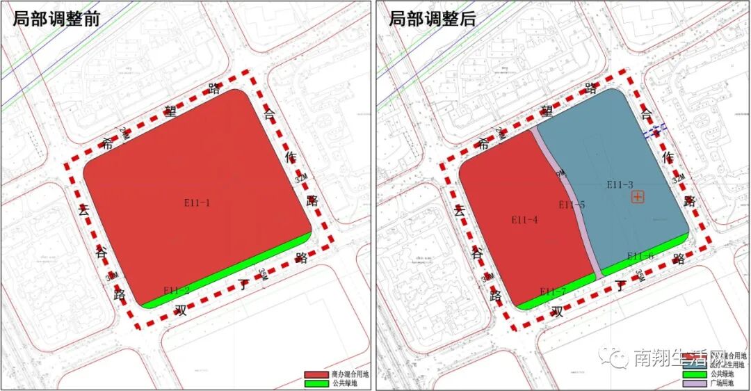 E11-4地块:用地性质仍为商办混合用地(C8C2),用地面积调整为25132平方米,容积率调整为4.0,建筑高度仍为80米,混合用地建筑量比例调整为“C8≥80%;C2≤20%”。