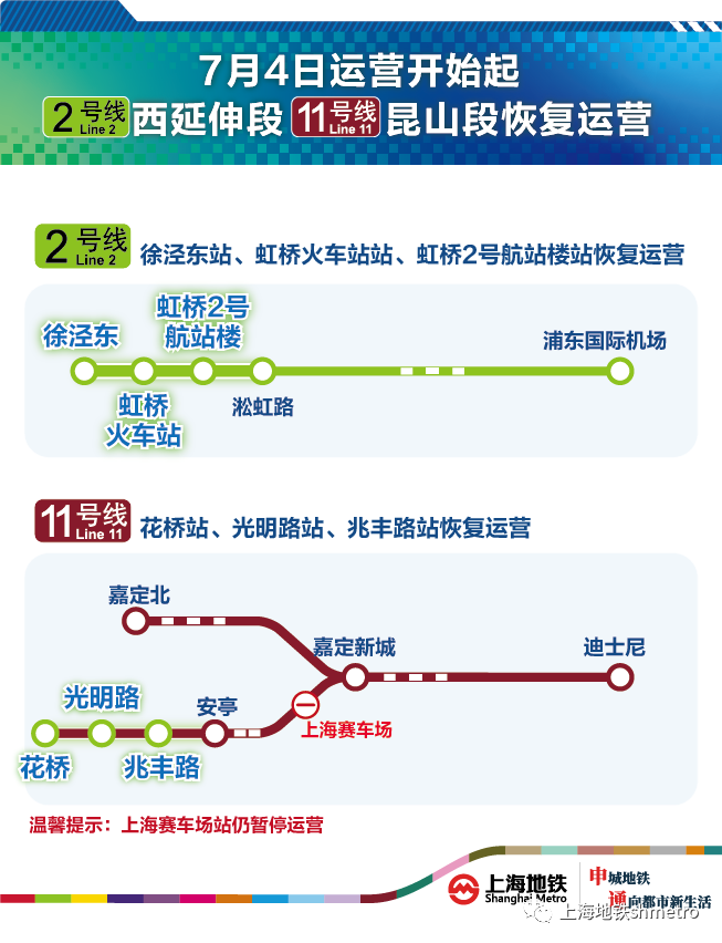 2022年7月4日运营开始起,上海地铁2号线徐泾东站、虹桥火车站站、虹桥2号航站楼站,以及11号线花桥站、光明路站、兆丰路站恢复运营。至此,除11号线上海赛车场站仍暂停运营外,上海地铁全网其他所有车站均提供正常运营服务。