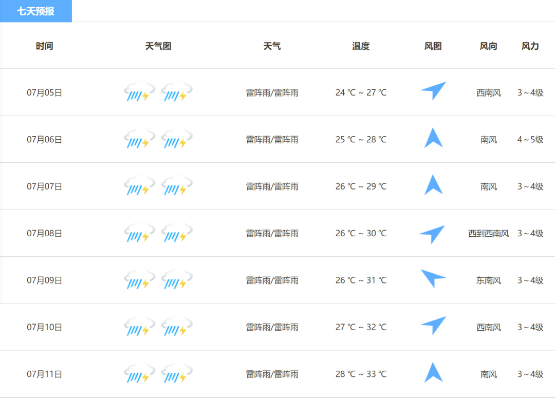 梅雨暂时没有收手的意思,明后天还有一次明显的降水过程,上班出行需注意强降水,还有雷雨大风天气的影响,提前做好防范。周后期阵雨时不时还会有,气温升高(最高32-33℃),闷热感比较强。