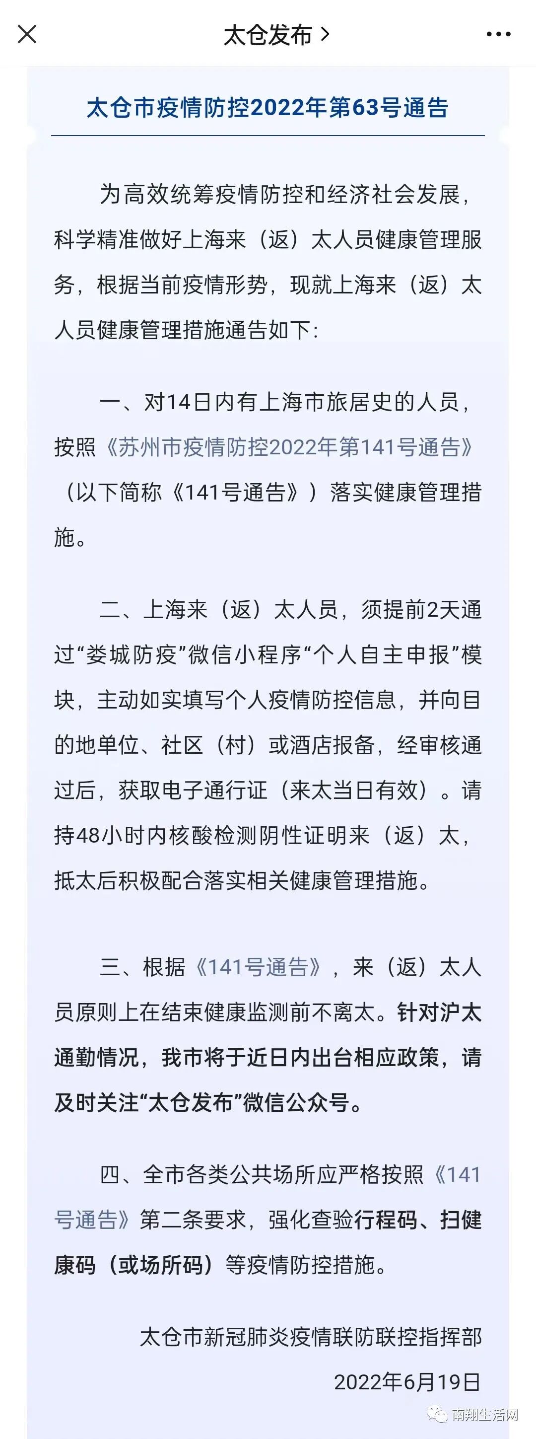 于此同时,除了昆山外,昨夜太仓也发布了关于上海来(返)太人员通告:上海来(返)太人员,须提前2天通过“娄城防疫”微信小程序“个人自主申报”模块。