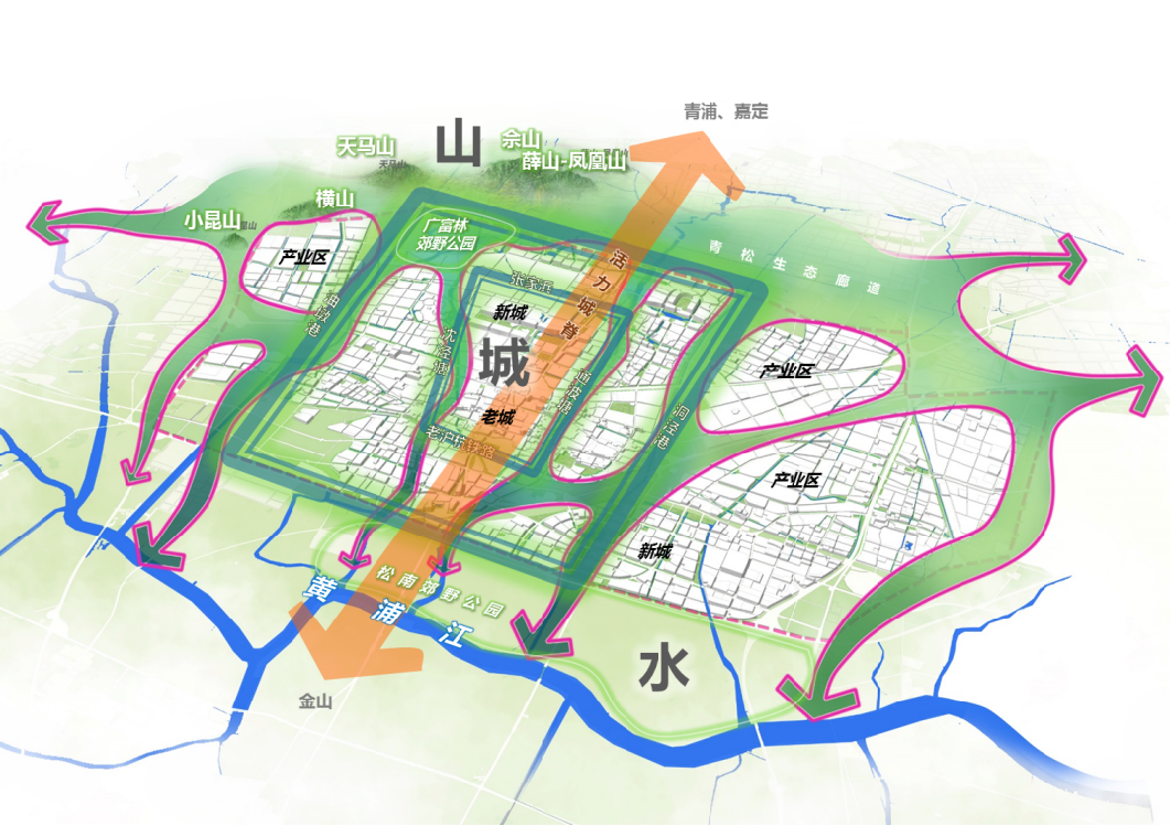 松江新城在功能、文化、环境和交通等关键要素上,强化不同功能片区的空间“缝合”策略。建设南北双中心,强化生态和文化的渗透、功能和交通的连通,营造“山水间、上海根、科创廊”的城市意象。