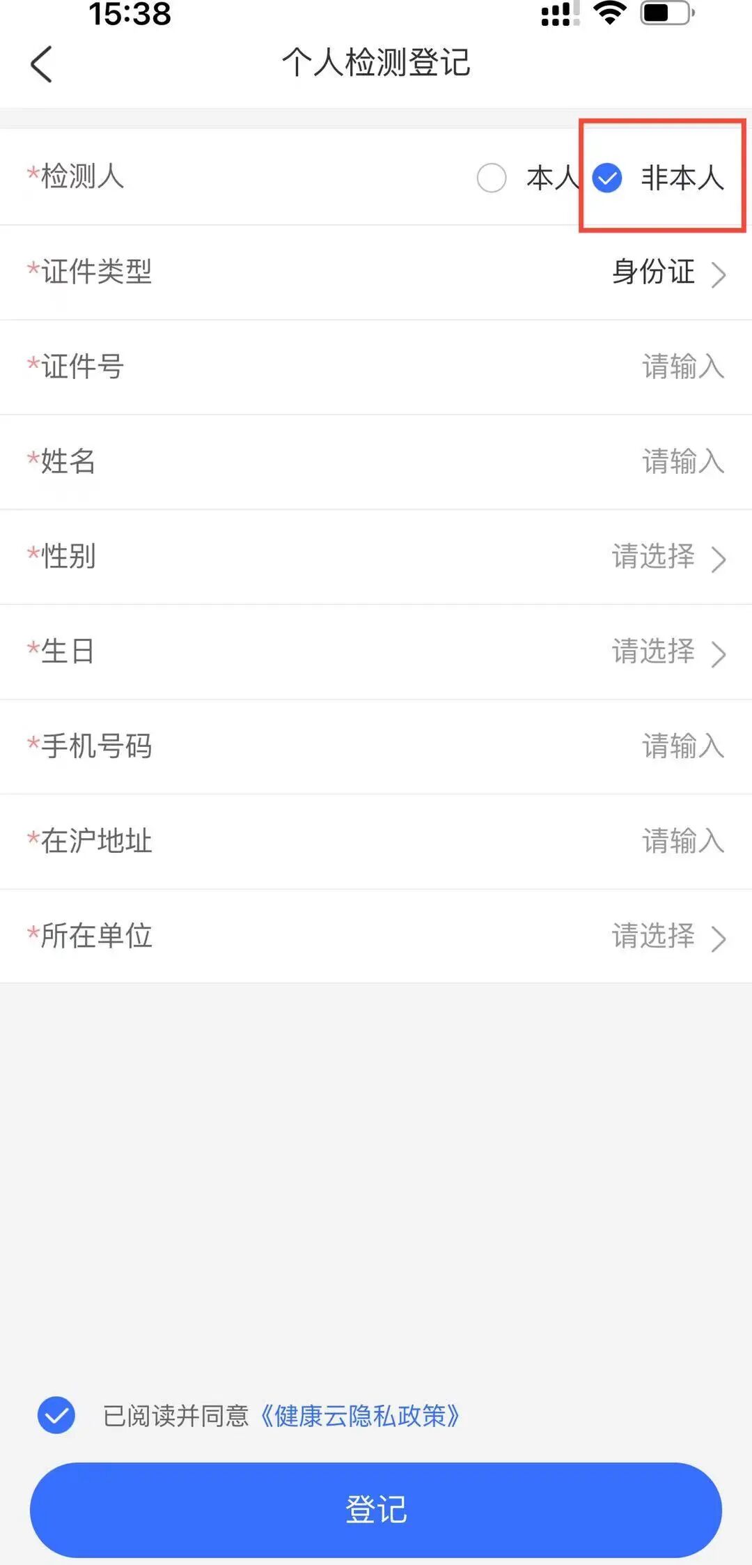 如非本人登记,请选择【非本人】,填写被登记人详细信息