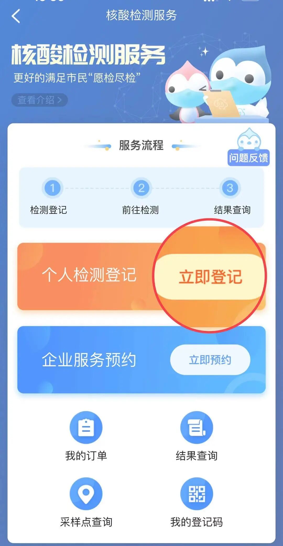进入【核酸检测】服务页面点击【立即登记】