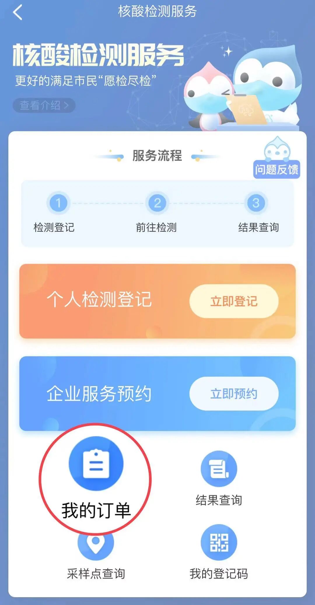 到核酸采样点后,在【核酸检测】服务页面找到【我的订单】,点击进入