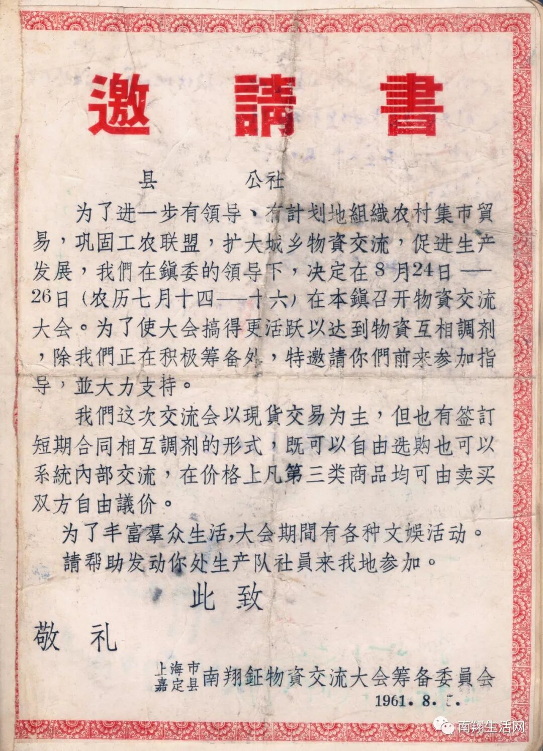 1961年8月20日,我们受邀去南翔镇接洽有关24-26日庙会设供应摊的具体事宜,如:看定场地、安排库房、解决膳宿等事宜。