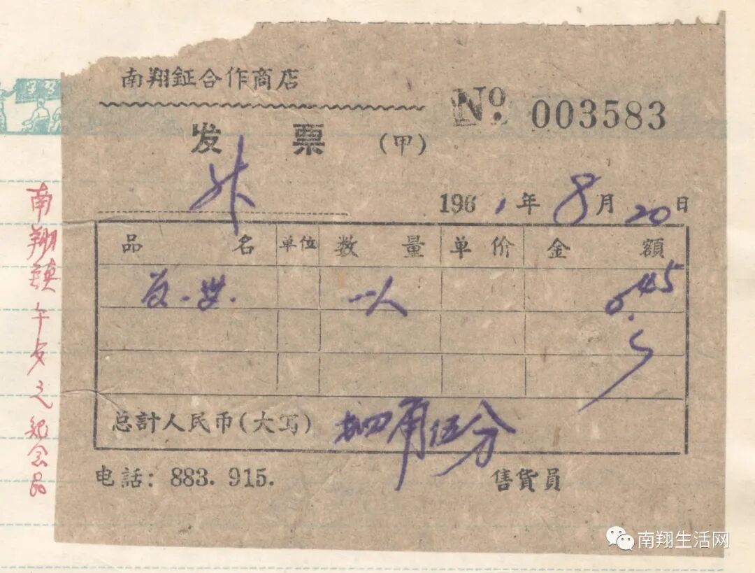 最后找到一家合作小饭店,价廉而物美,于是乘虚而入,占了座位。三个人,吃了“素什景”、“炒素”、“素三丝”及一个汤,共计吃了一元三角五分,平均每人吃四角五分,左边的一张发票,即是“南翔镇第一饭店”的纪念品如下图▽