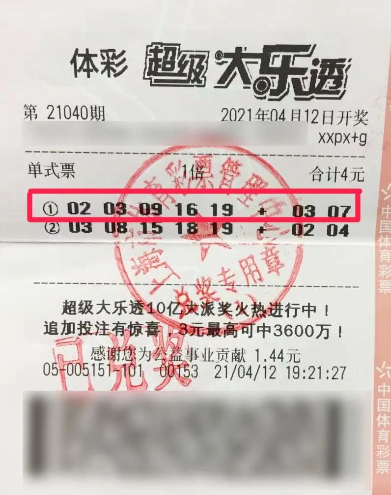 晚饭过后,秦老伯赶紧去彩票店打了2注,“第一注我完全参考了捡来的彩票,只是去掉了‘08’,第二注我保留了‘03’、‘08’、‘19’自己又加了自选号,所以只是看上去像机选票,其实并不是,很庆幸自己没有删错号,太幸运了!”