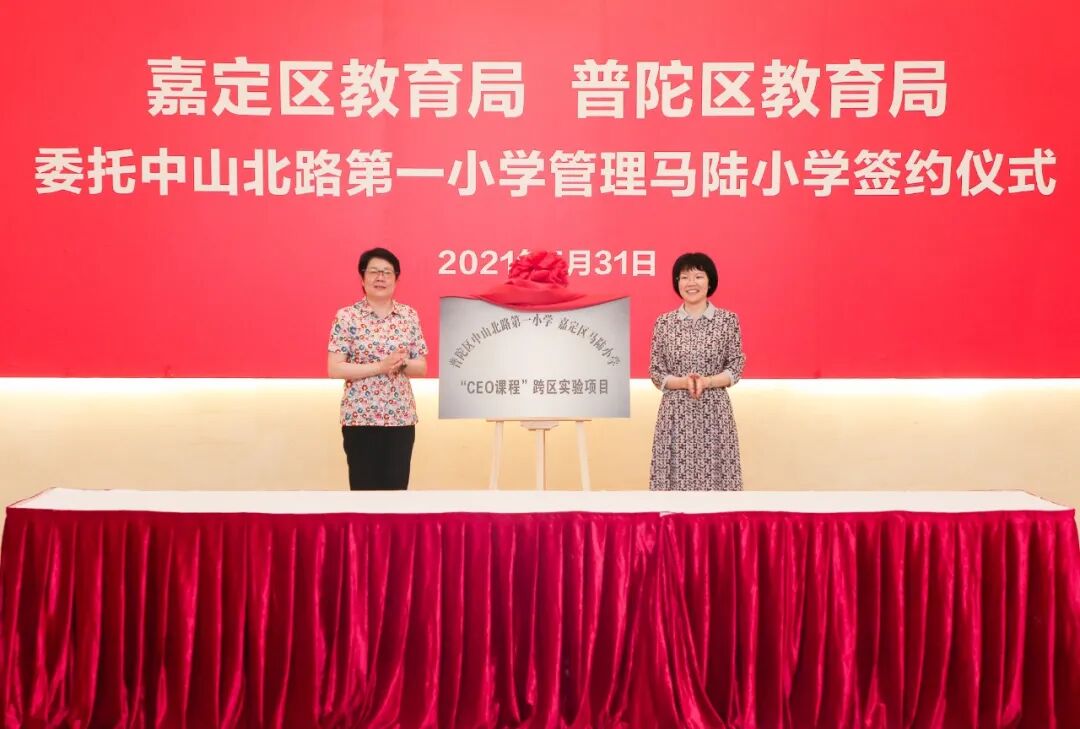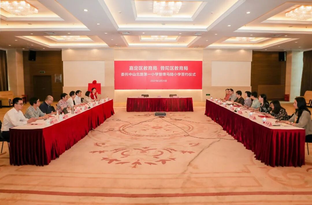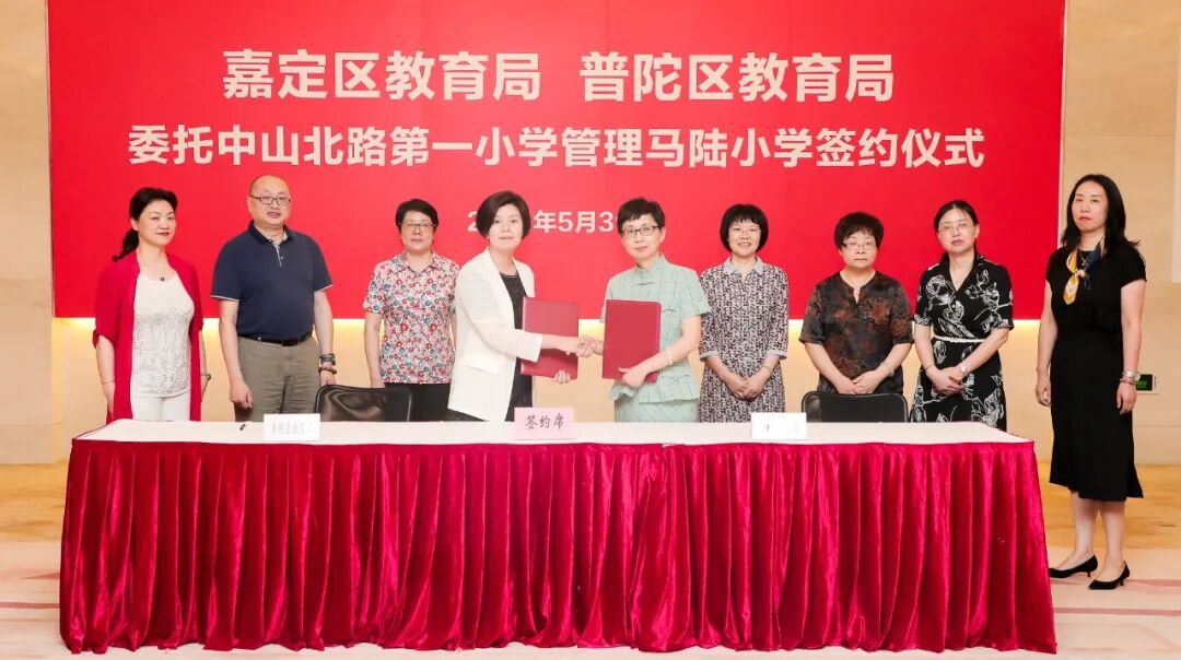 5月31日下午,嘉定区教育局、普陀区教育局委托中山北路第一小学管理马陆小学签约仪式在马陆镇政府举行。普陀区教育工作党委书记胡俊,嘉定区教育工作党委书记王晓燕,普陀区教育局局长唐晓燕,嘉定区教育局局长祝郁出席签约仪式。活动由嘉定新城管委会委员、马陆镇副镇长樊立新主持。
