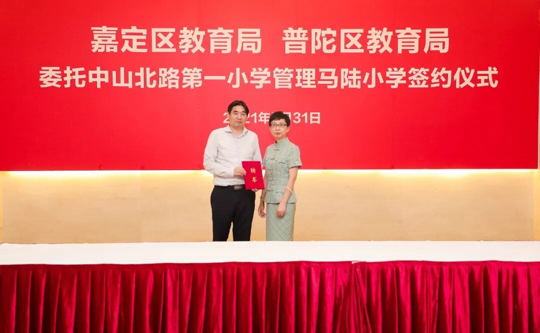 祝郁为华东师范大学教育学部教育学系教授、主任,博士生导师,教育部人文社会科学重点研究基地基础教育改革与发展研究所副所长黄忠敬颁发专家聘任证书。   根据协议,中山北路第一小学将积极开展委托管理工作,包括输出办学理念,参与教师培训,按需给予学校管理、课程设置、队伍建设和教科研等方面的指导,帮助马陆小学进一步提升管理水平和办学影响力。委托管理期间,通过专题研讨会、交流展示活动等方式向嘉定区其他同类学校辐射经验。