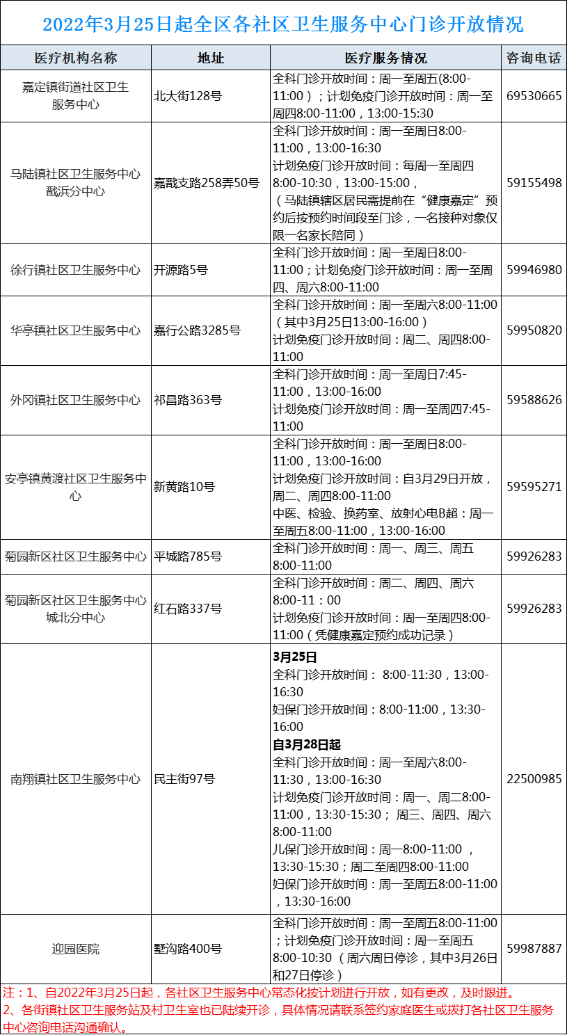 近期,本区多家医疗机构因配合疫情协查工作和防疫要求,调整了医疗服务时间。   为方便市民就医问诊,嘉定区卫生健康委整理了各单位开诊情况,在“健康嘉定”微信公众号上发布,供广大市民参考。   请市民朋友也同时关注各医疗机构官方网站和微信公众号。