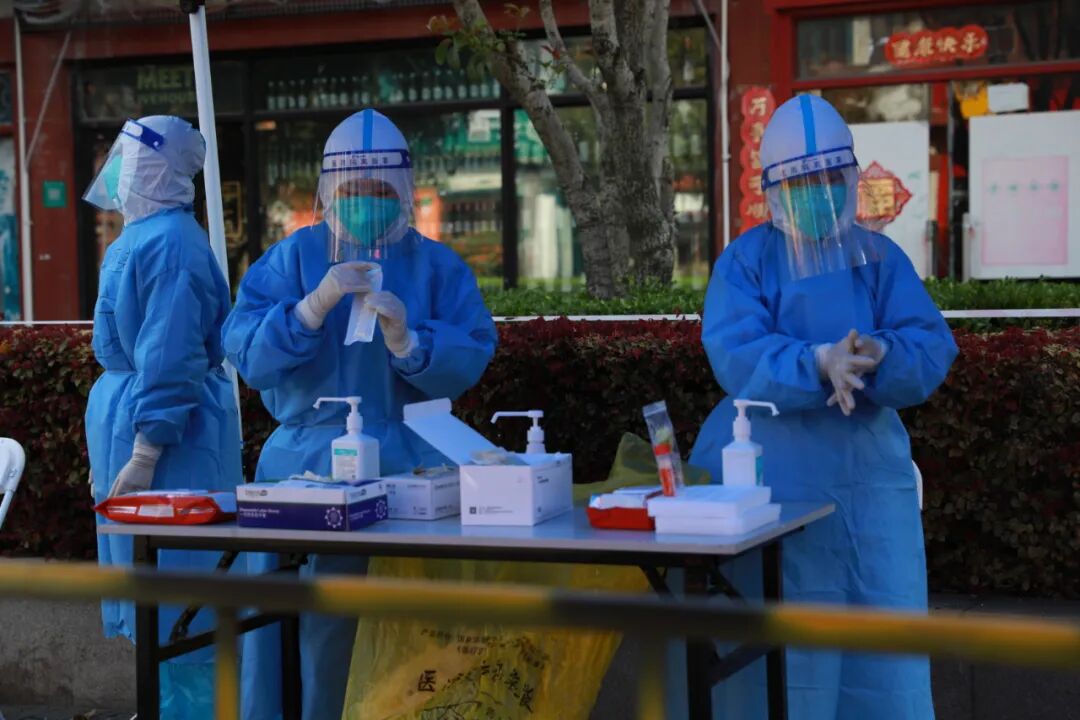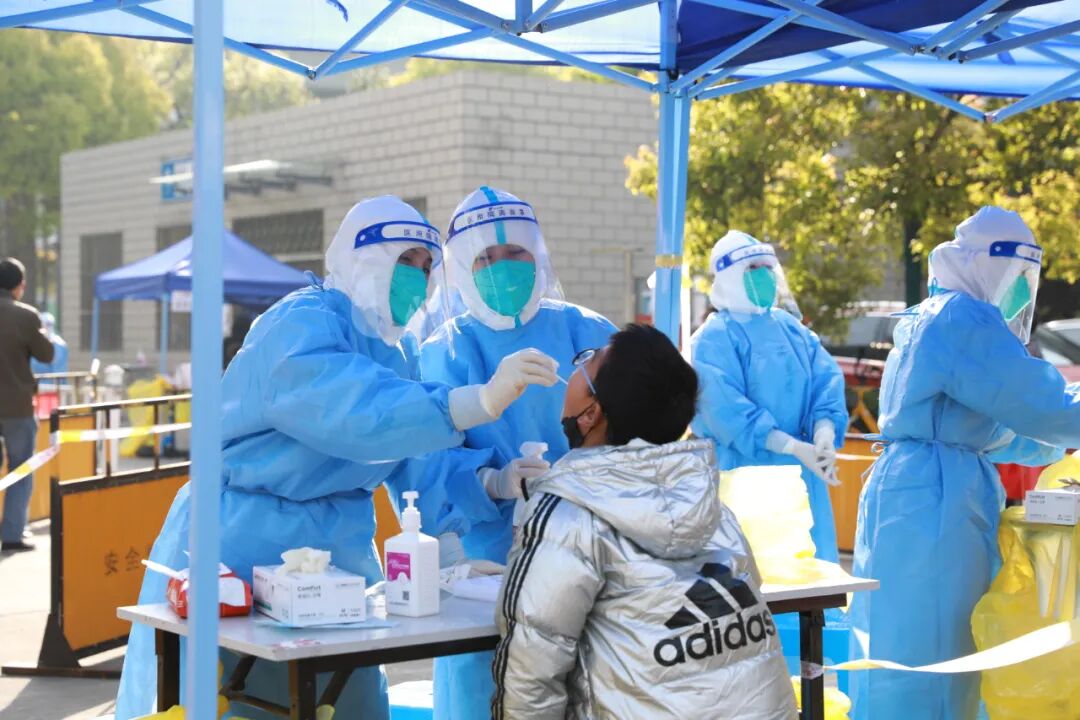 在古猗新苑二期,4位来自海南的“90后“医护人员完成了1500多人小区的核酸检测工作。