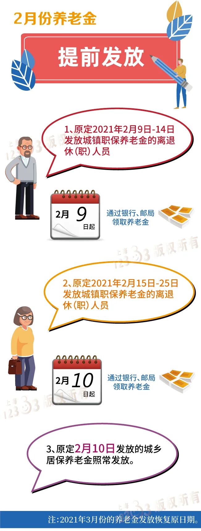 2021年2月11日至17日恰逢春节长假,为了让广大离退休(职)人员过一个愉快祥和的春节,上海市人力资源和社会保障局将对春节长假期间发放的离退休(职)人员养老金提前发放。具体安排如下↓