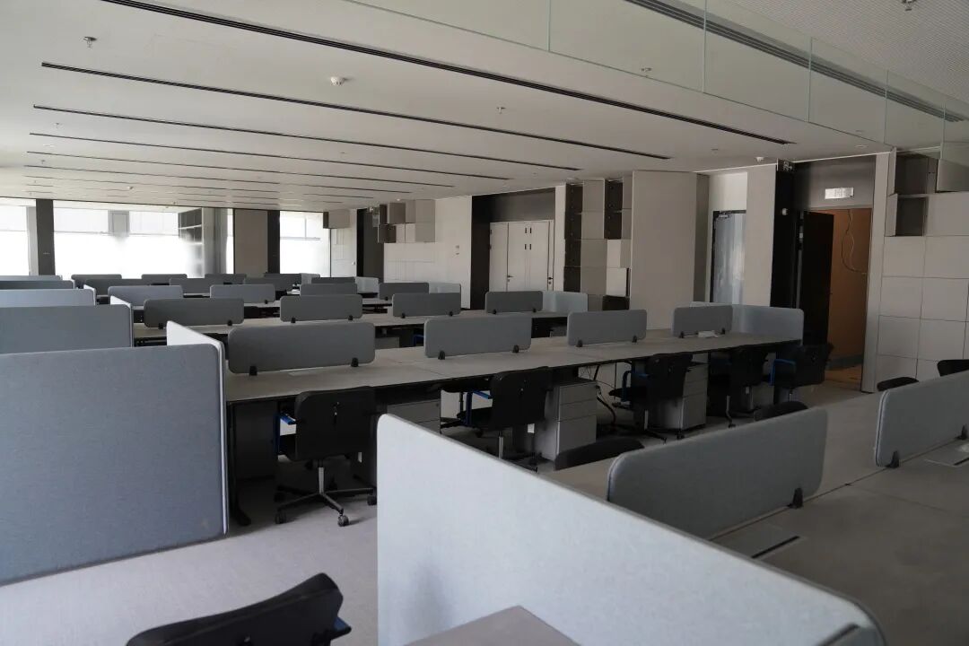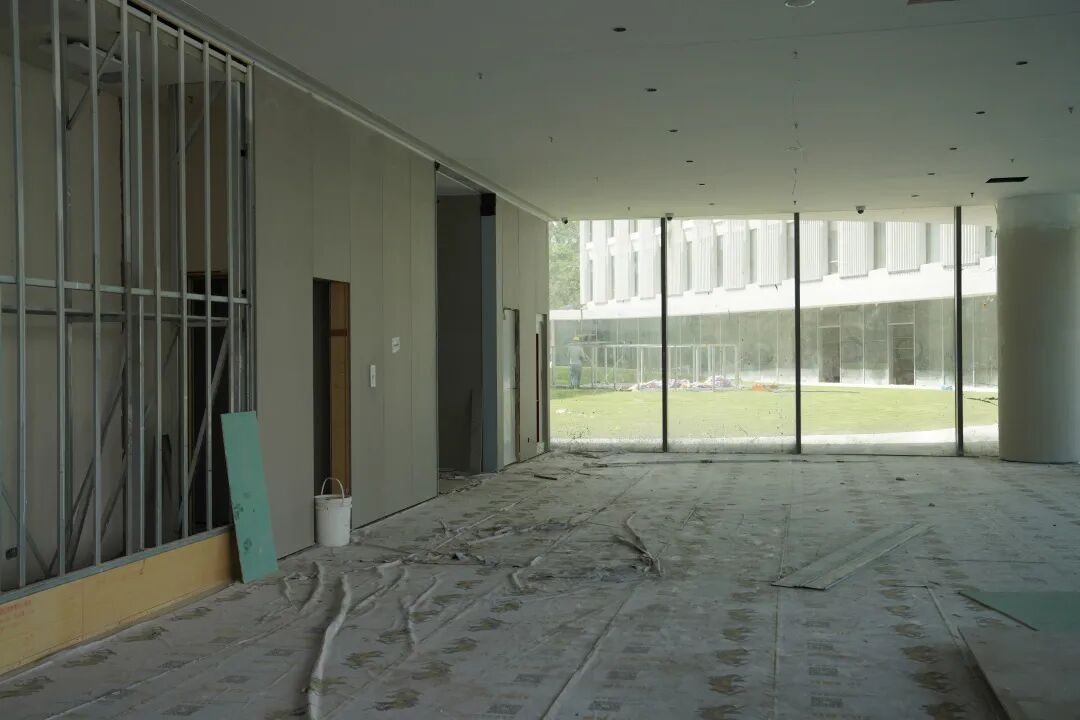 小嘉在施工现场看到,研发总部大楼由5栋塔楼环绕而成,中心位置为下沉式广场。建筑的主体和外立面已全部完成施工,工人正在加紧进行内部装修。