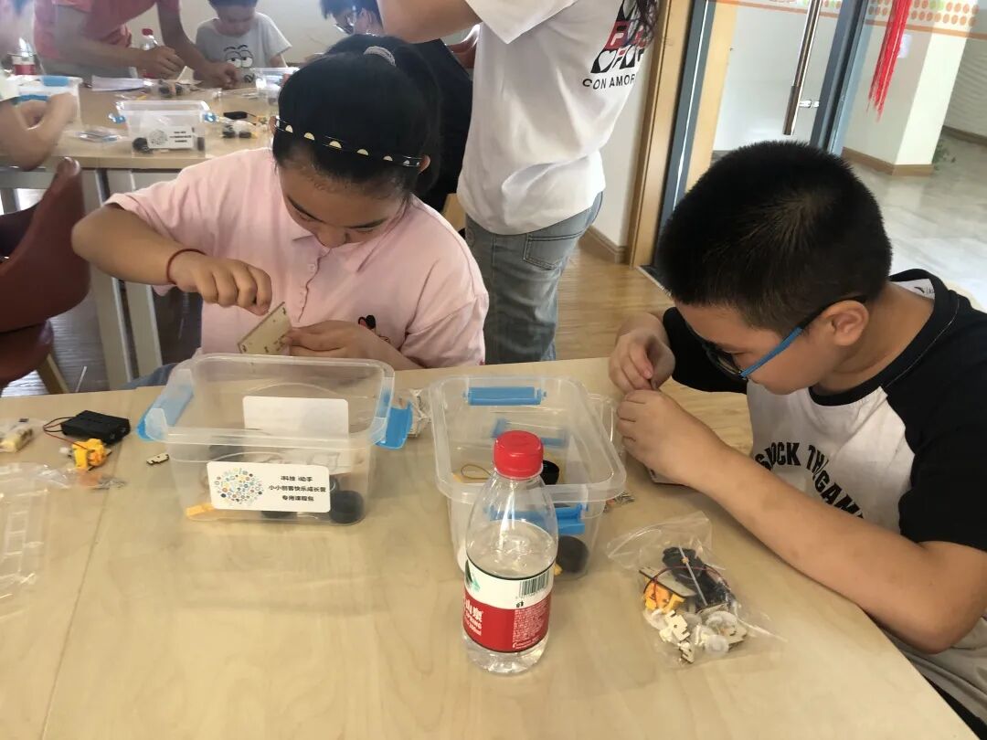 过程中,不少孩子在安装电力装置上遇到困难,也不害羞,热情地参与提问,有些年龄较大的孩子还会主动帮助年纪小的孩子,现场好不热闹。最终,在老师和工作人员的帮助指导下,所有孩子都成功完成了自动的扫地机器人,大家迫不及待地在地面尝试起来,脸上洋溢着无比幸福和自信的笑容。