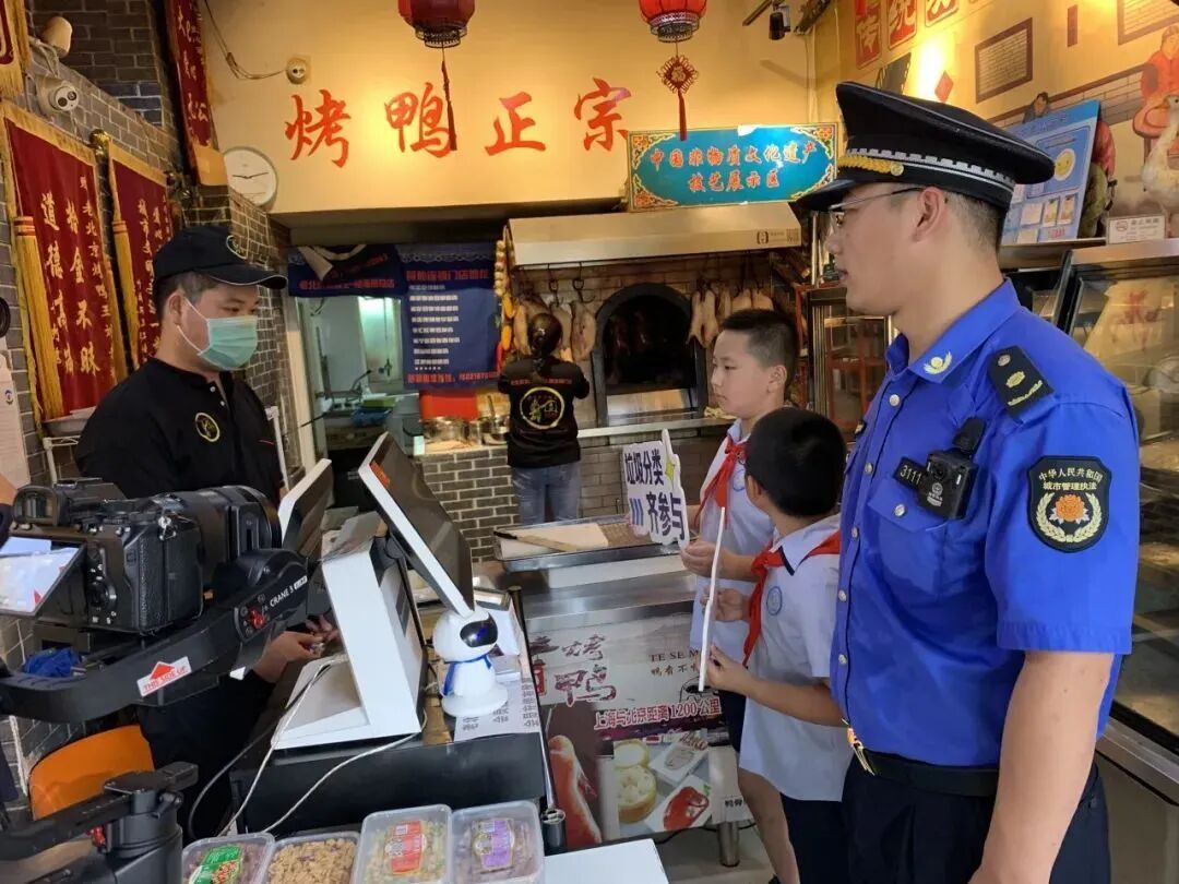 活动现场,来自嘉定工业区的12名小学生和城管队员、市场监督人员、环卫作业人员、文明城区志愿者组成一支“文明e嘉”志愿服务队伍,对沿街店铺开展上门宣传,向商家倡议,推动落实落细诚信经营、文明餐饮和垃圾分类等管理责任。